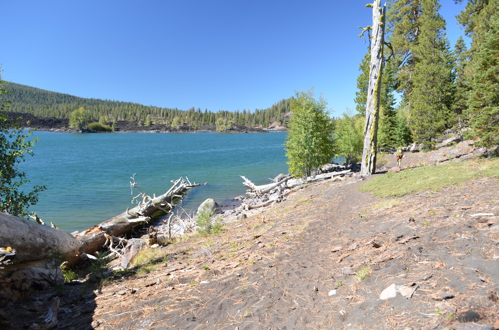 The shores of Butte Lake with a backpacker on the trail in the distance and the Fantastic Lava Beds in the background.