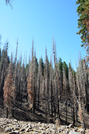 A burned area of forest on a hillside on the Crags Lake Trail.