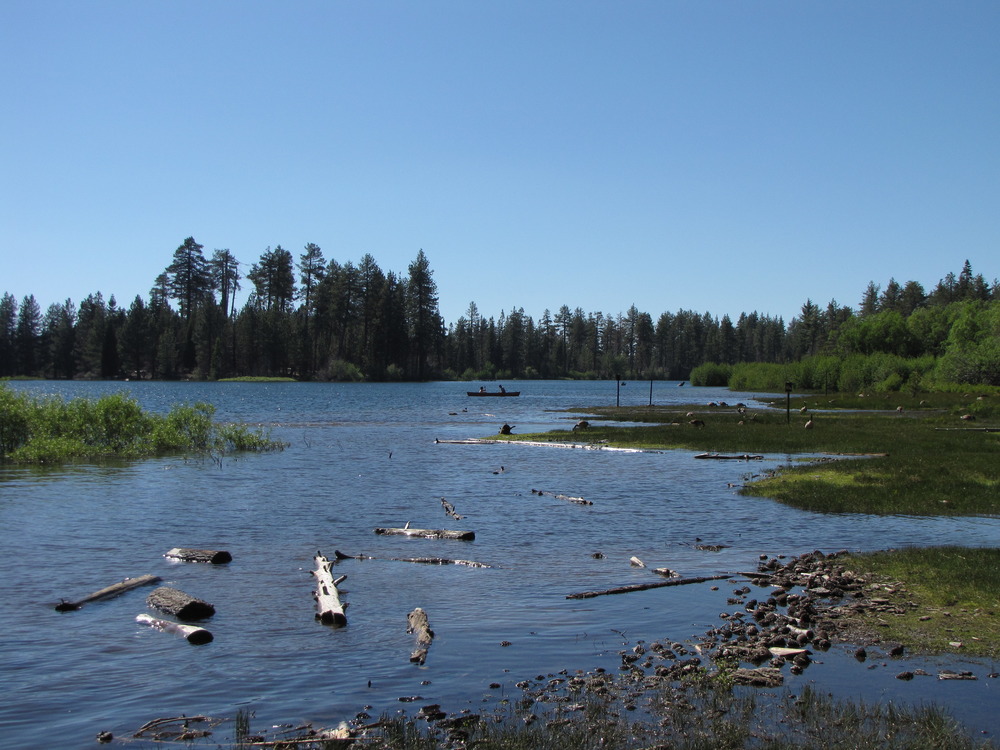 Small logs floating in the water on the grassy shores of Manzanita Lake with a canoe in the distance.
