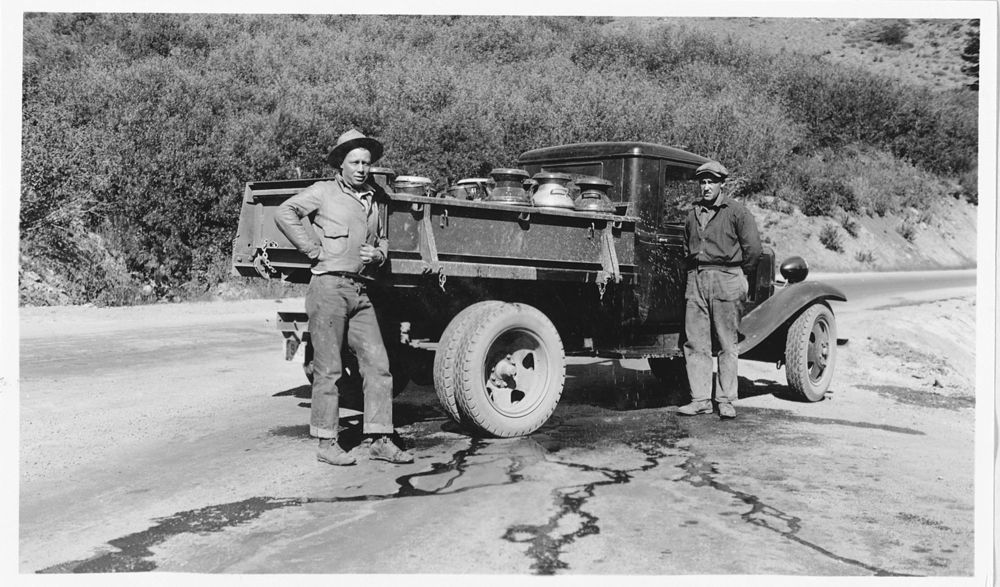 Administrative Collections: Album 5 (Emergency Conservation Works) -Ranger Richard Book and other man next to pickup truck loaded with canisters of fish for fish planting