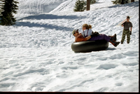 Two people riding a black inflatable tube at the sledding area near the Kohm Yah-mah-nee Visitor Center.