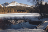A view of the snow-dusted Chaos Crags and Lassen Peak rising over partially frozen Manzanita Lake with a snow-covered bridge over Manzanita Creek.
