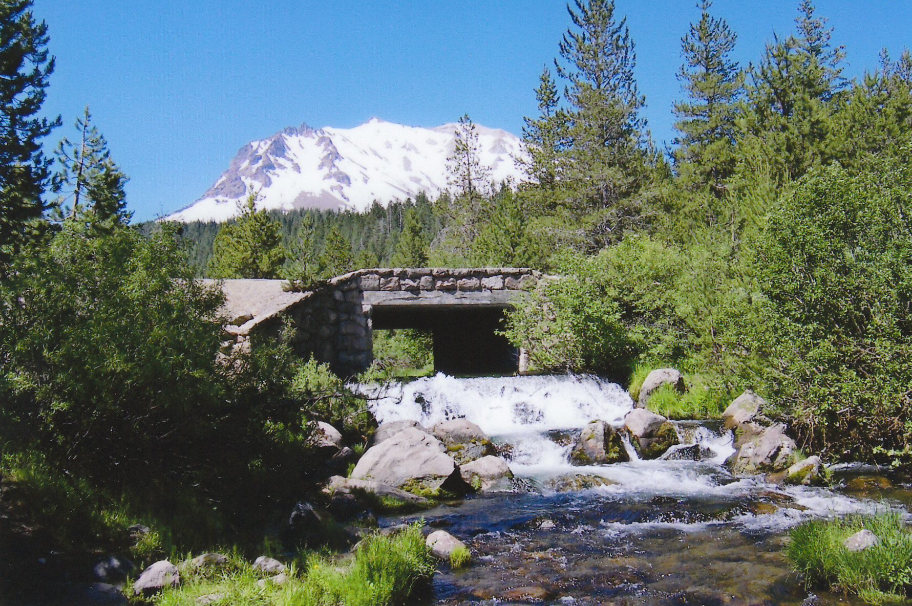 Snow-covered Lassen Peak rising over a bridge over Hat Creek with water cascading down the rocky creek.