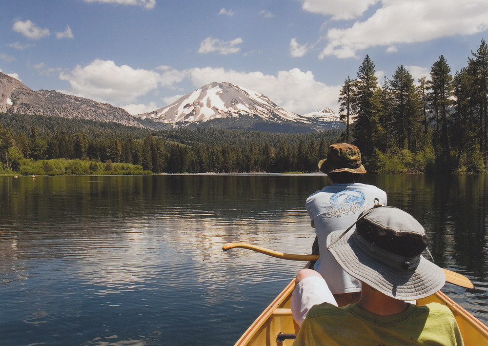 People in a canoe paddling on the calm blue waters of Manzanita Lake with Lassen Peak across the lake.