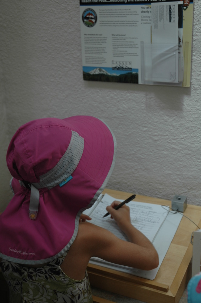 A young girl signing a logbook with a Reach The Peak sign on the wall above in the Loomis Museum.