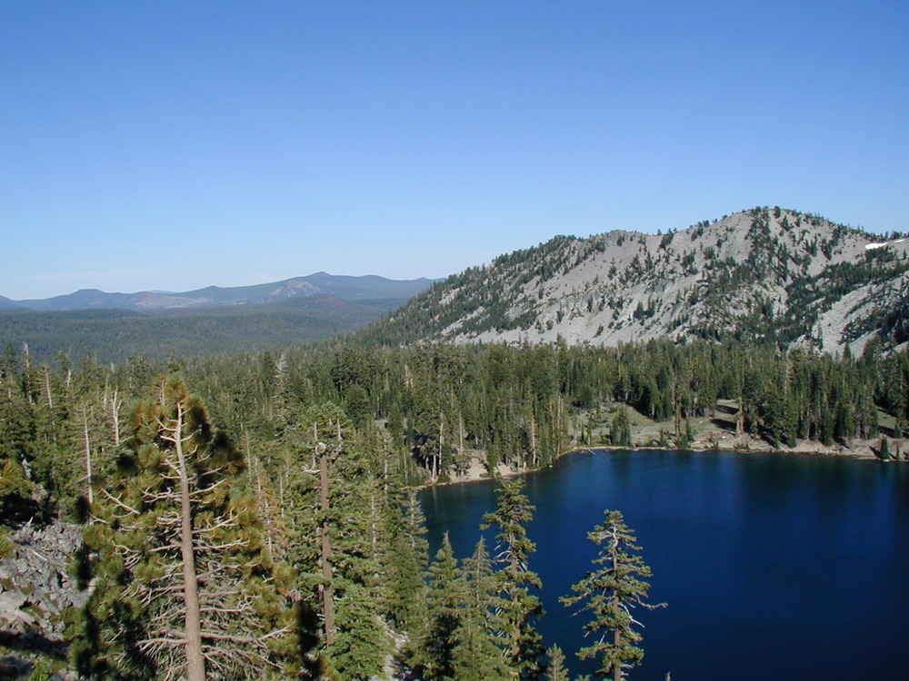 The view overlooking Shadow Lake from a nearby mountain with the blue waters of the lake below.