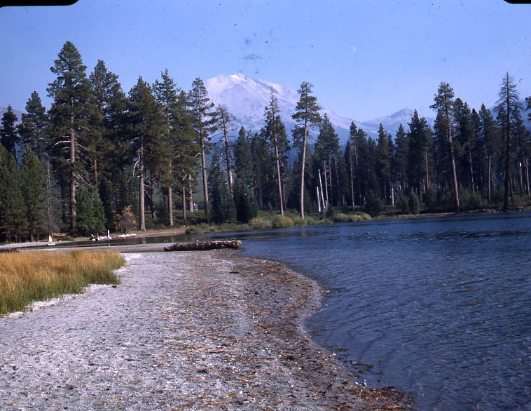 Dewey S. Weiss Historical Photograph Collection: Shore of Manzanita Lake with Lassen Peak in background
