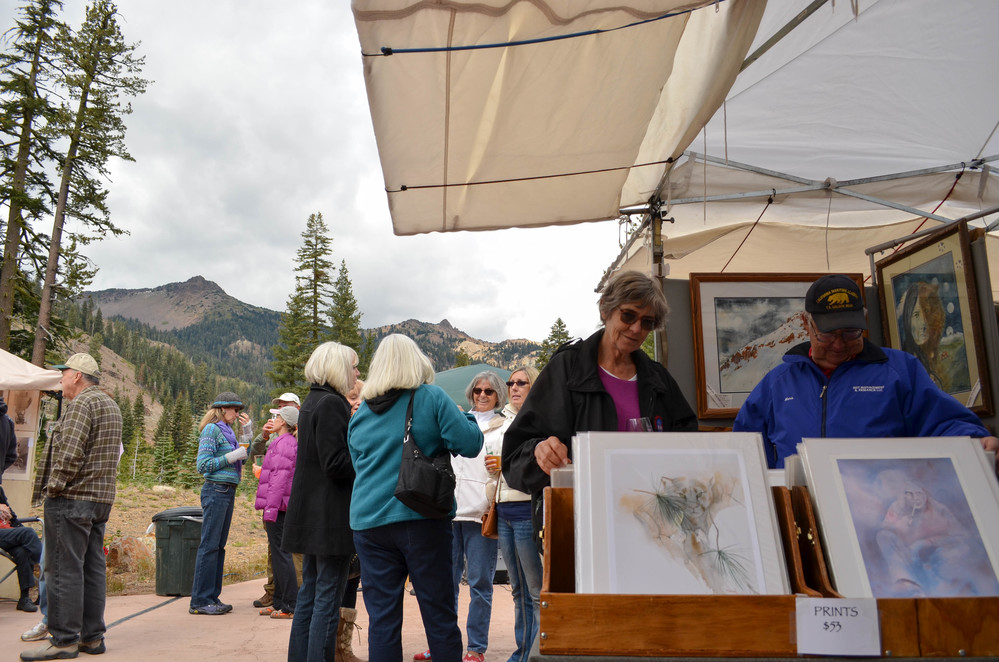 A couple checks out Art in a booth, with a crowd of others and great view in background.