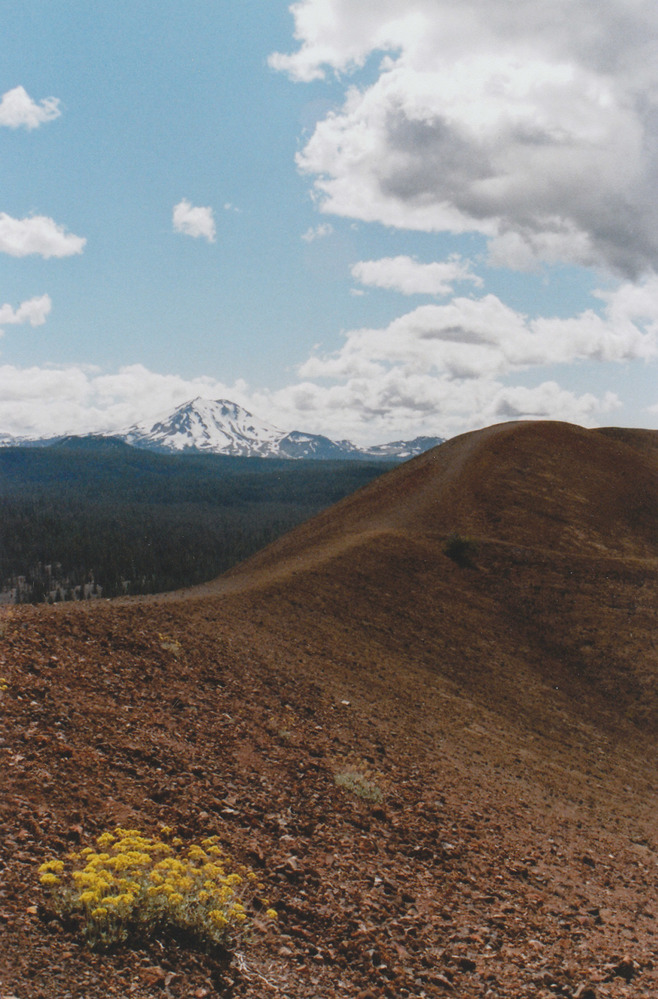 Snow-covered Lassen Peak rising in the distance viewed from the crater atop the Cinder Cone with yellow wildflowers.