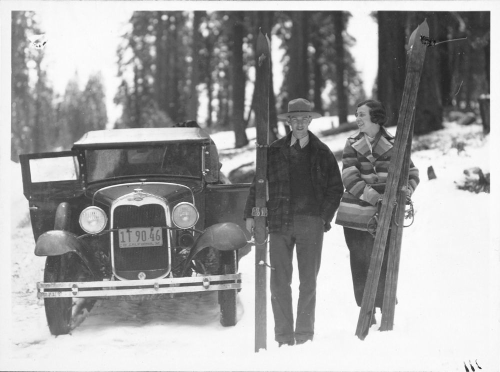 Arthur G. Holmes Collection: Album 3--Neil Moore and woman standing next to car holding skis