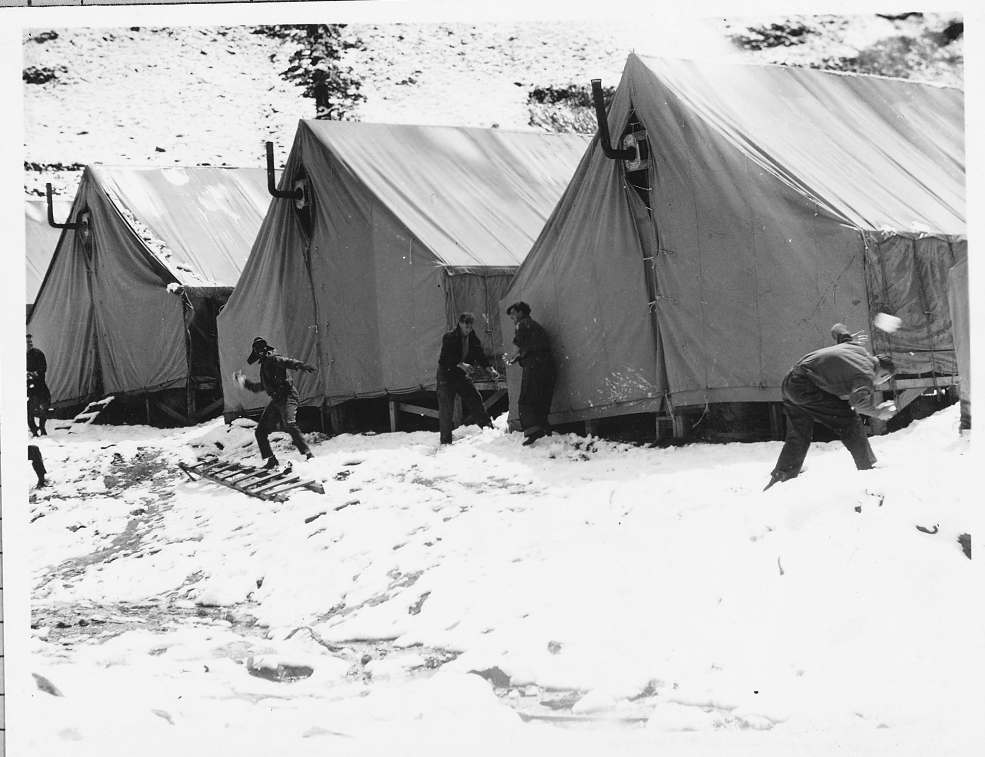 Administrative Collections: Album 5 (Emergency Conservation Works) -Views of Camp Southwest showing tent quarters and mess hall, and CCC workers engaged in a snowball fight