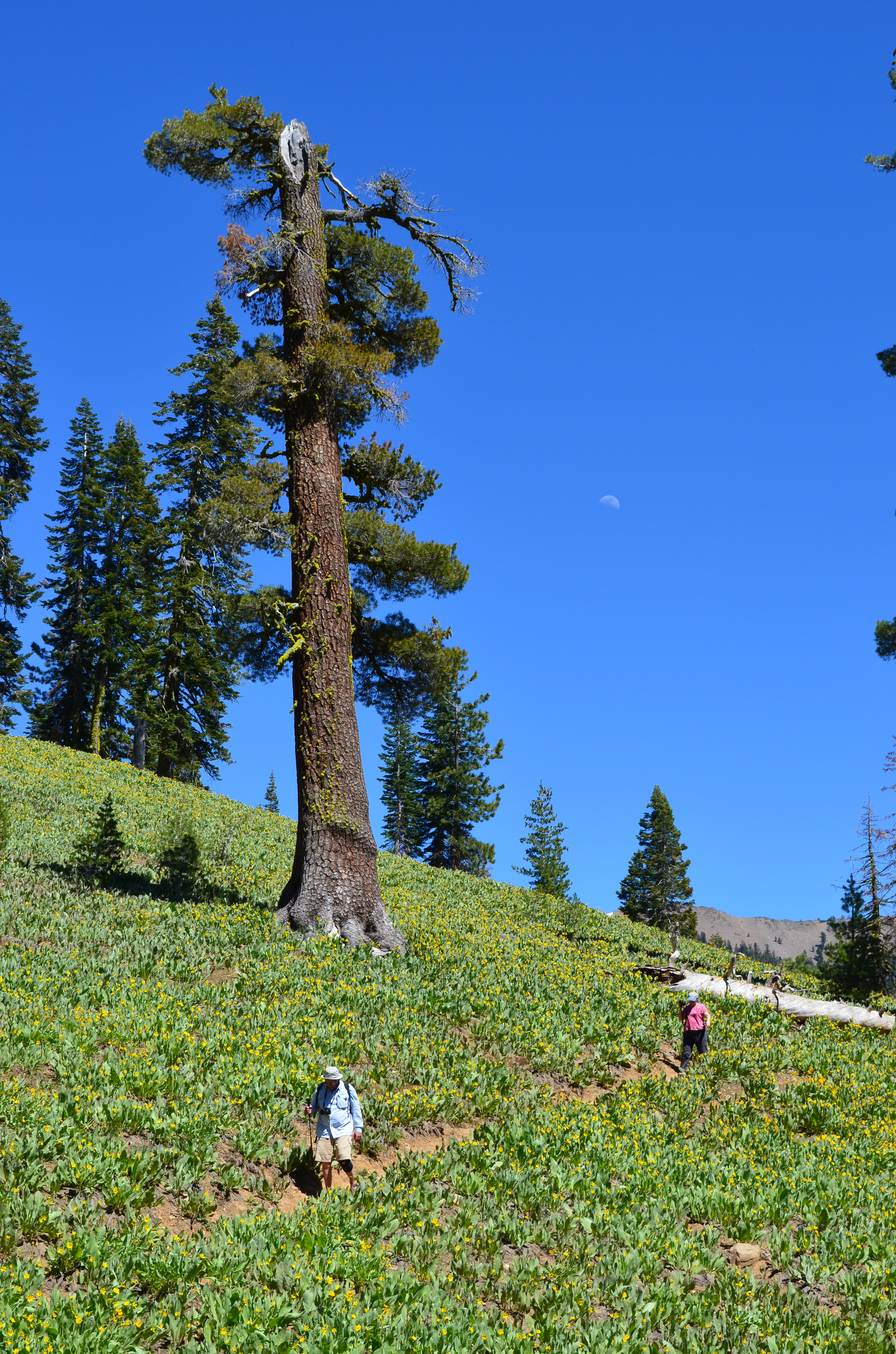 Hikers on the trail to Mill Creek Falls with the moon in the sky.