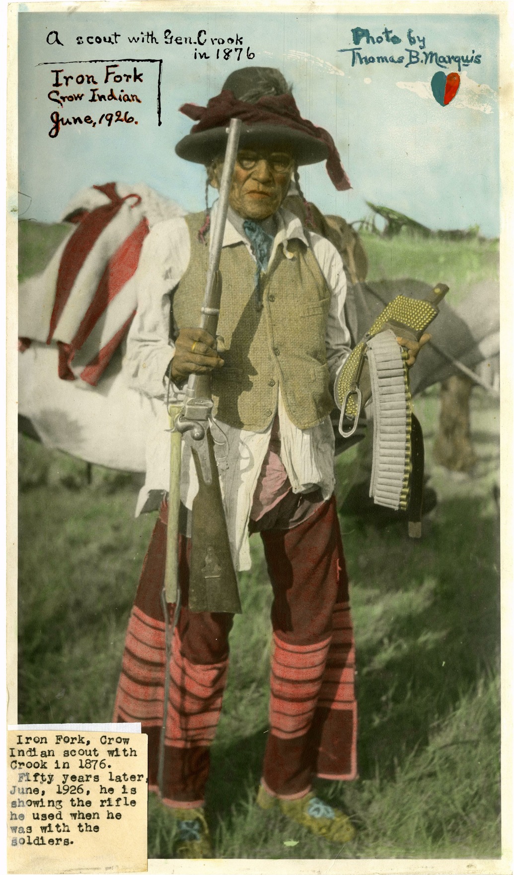 LIBI_00012_01926; A HAND-TINTED PHOTOGRAPH OF IRON FORK, A CROW INDIAN SCOUT WITH GENERAL CROOK, STANDING FULL LENGTH VIEW IN GLAZED FRAME; BY DR. MARQUIS IN 1926; WITH HANDWRITTEN NOTATION AND TYPEWRITTEN CAPTION (LOWER LEFT CORNER) ON PRINT.; print, photographic; Courtesy of the National Park Service, Little Bighorn Battlefield National Monument, LIBI_00012_01926, Thomas B. Marquis, "Iron Fork, Full-Length View," 1926