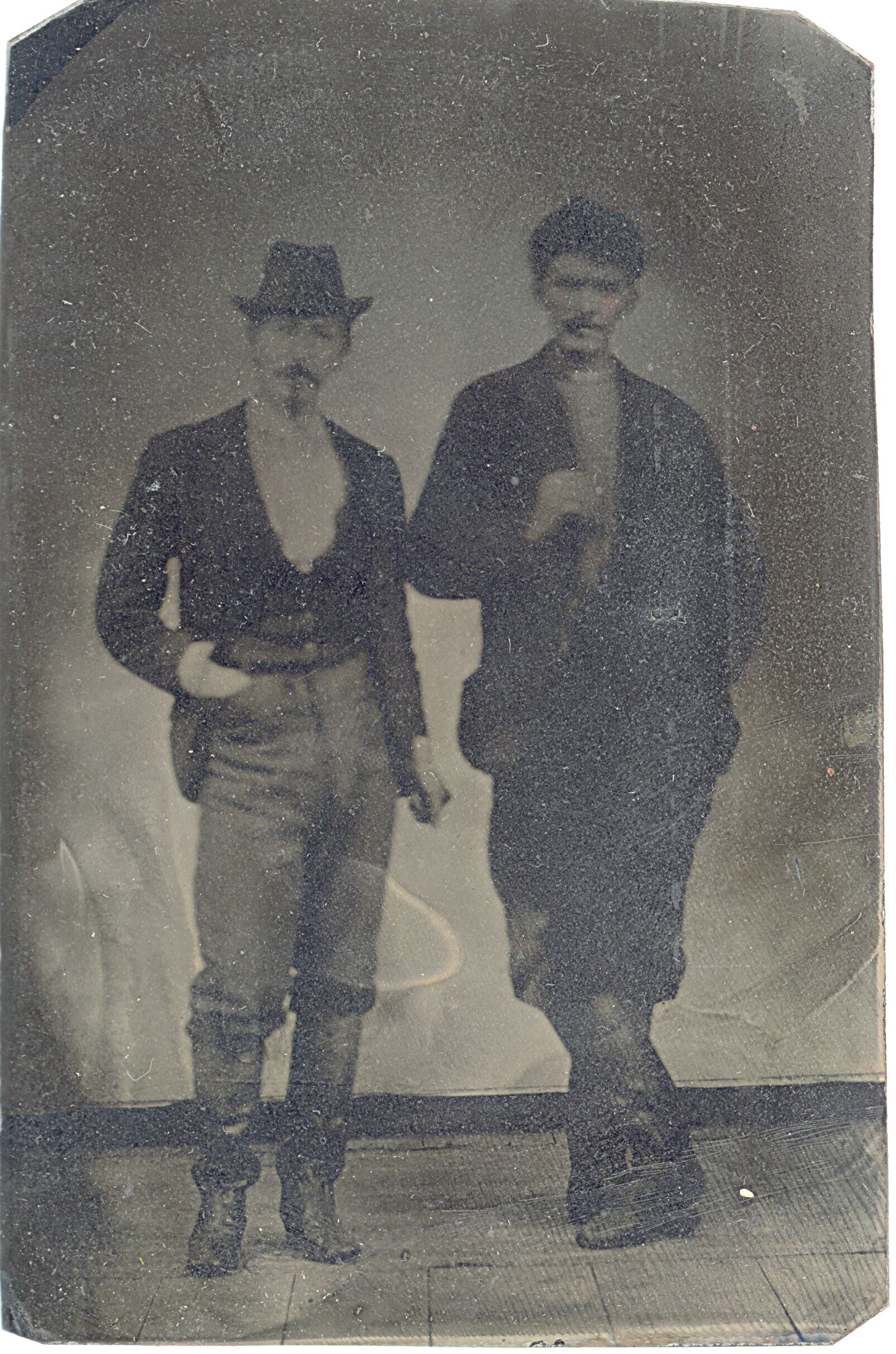 LIBI_00305_10676; A tin type photo, 2 3/4" x 4", uncolored and inserted into two pieces of paper board frame measuring 3" x 4 1/2". The insert in two pieces with six stamp hinges a fixed, but no longer serviceable. The image depicts two men in civilian clothes. The one on the left is identified as Abram B. Brant. A handwritten note in pencil on the verso reads: “Uncle Abram (left) B. Brant + a friend- Troop D 7th Cavalry Died Oct 4, 1878”. The photo is badly faded. It was taken by an unknown photographer circa 1878. ; photograph; Courtesy of the National Park Service, Little Bighorn Battlefield National Monument, LIBI_00305_10676, Unknown Photographer, "Abam B. Brant and a Friend," circa 1878.