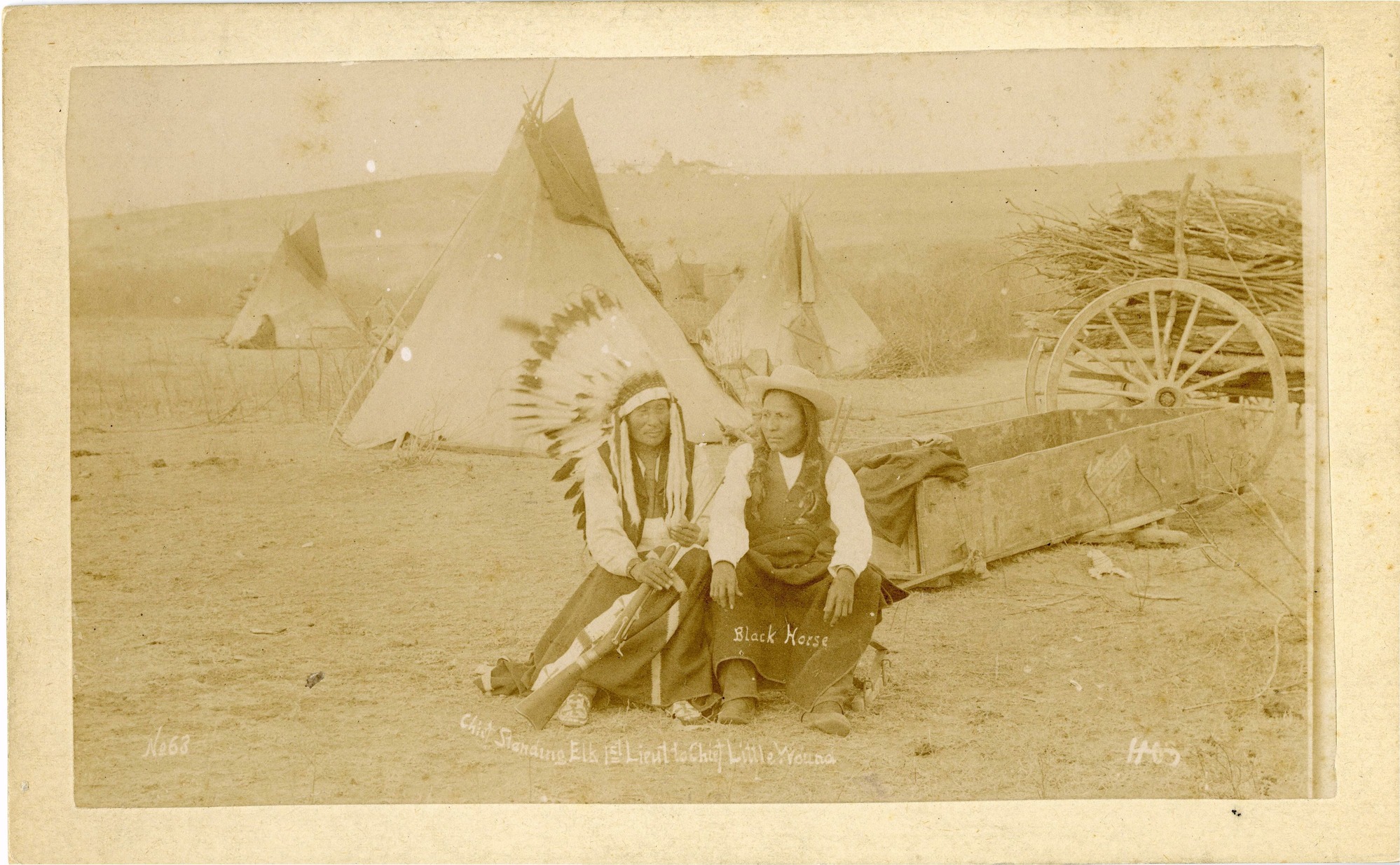 LIBI_00312_10895; A cabinet card photograph. This image depicts two Native American Men, Chief Standing Elk (left) and Black Horse (right). Standing Elk wears a feathered headdress and holds a Springfield Carbine with two metal bands around the stock. Black Horse wears a dark vest over a light shirt. They sit in front of three tipis. There is a wagon loaded with sticks in the right of the photo. Along the bottom in white lettering are the words: “No. 63”; “Chief Standing Elk, 1st Lieut to Chief Little Wound” and “HOS”. Black Horse is also identified by white lettering across his legs. On the verso are printed ads. This image was taken by an unknown photographer on an unknown date. ; cabinet card photo;Courtesy of the National Park Service, Little Bighorn Battlefield National Monument, LIBI_00312_10895, Unknown Photographer, "Chief Standing Elk and Black Horse Sitting in Front of Tipis," date unknown.