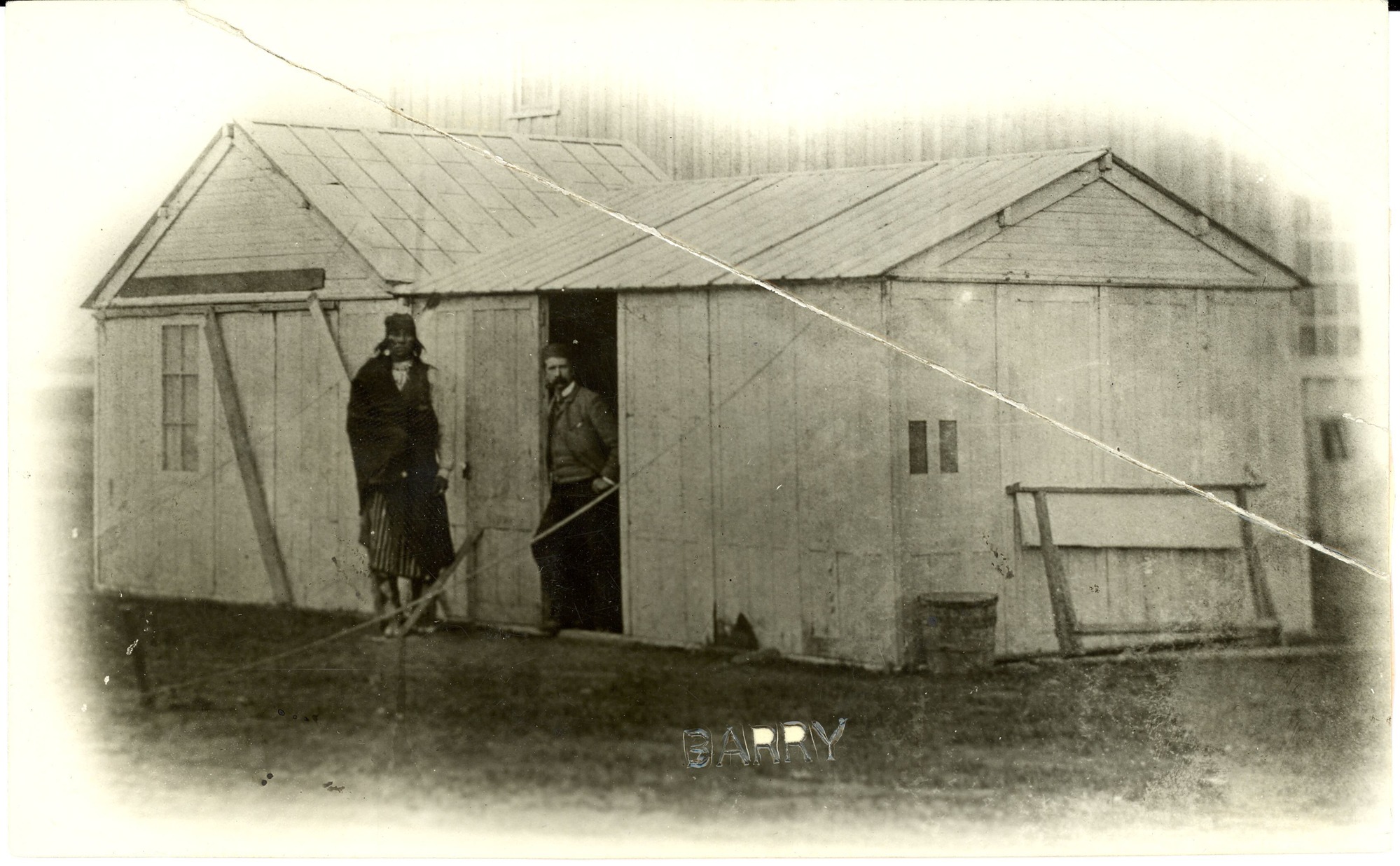 LIBI_00011_07158; A black-and-white photograph of D. F. Barry's prefabricated gallery at Fort Buford; depicting Barry standing in the doorway, Chief Shields is to his right; D. F. Barry copyrighted; print has fold mark running diagonally from upper-left to below center-right; created on unknown date. On the verso, Barry label and handwritten notation reads, "Barry's Old Frontier Gallery" and "Barry and Chief Shield."; PRINT, PHOTOGRAPHIC; Courtesy of the National Park Service, Little Bighorn Battlefield National Monument, LIBI_00011_07158, D. F. Barry, "D. F. Barry's Old Frontier Gallery," date unknown
