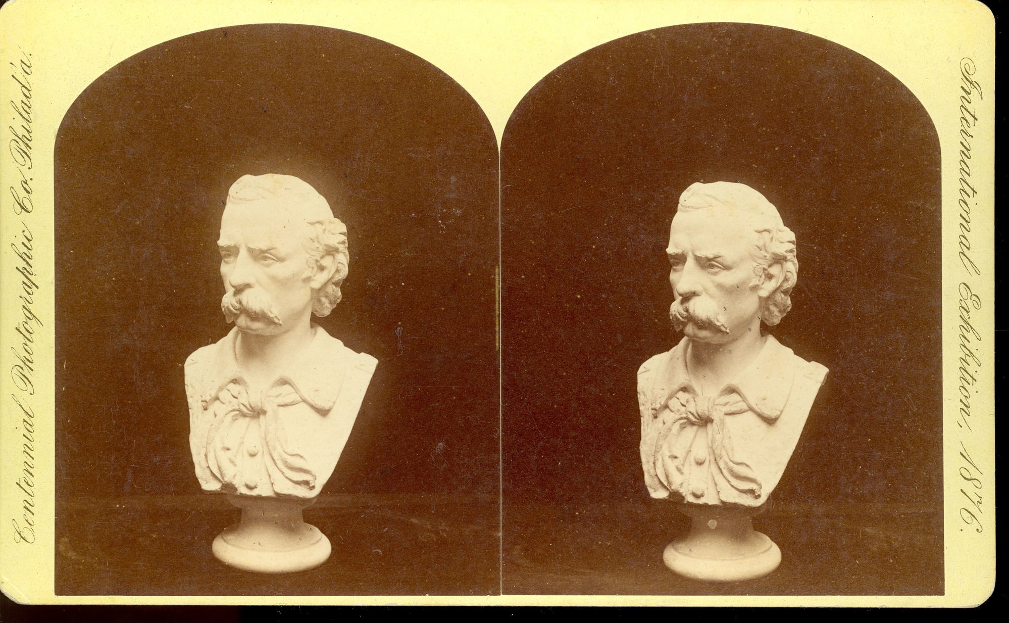 LIBI_00019_00372; This item is an albumen stereograph (card-mounted photograph) of a sculpture bust of General George A. Custer. The photograph is 4 1/4 x 7" mounted on a pale yellow mount and was produced by Wilson and Adams of Philadelphia. The location of the plaster model is unknown but was shown at the International Exhibition of 1876. On the front, typed notations read, "Centennial Photographic Co. Philad'a" and "International Exhibition, 1876." The photographer's stamp is printed on the verso.; STEREOGRAPH [Stereoscopic card photograph]; Courtesy of the National Park Service, Little Bighorn Battlefield National Monument, LIBI_00019_00372, Wilson and Adams, "Plaster Bust of General George Armstrong Custer on Card with 'International Exhibition 1876' Written on the Left Side," date unknown