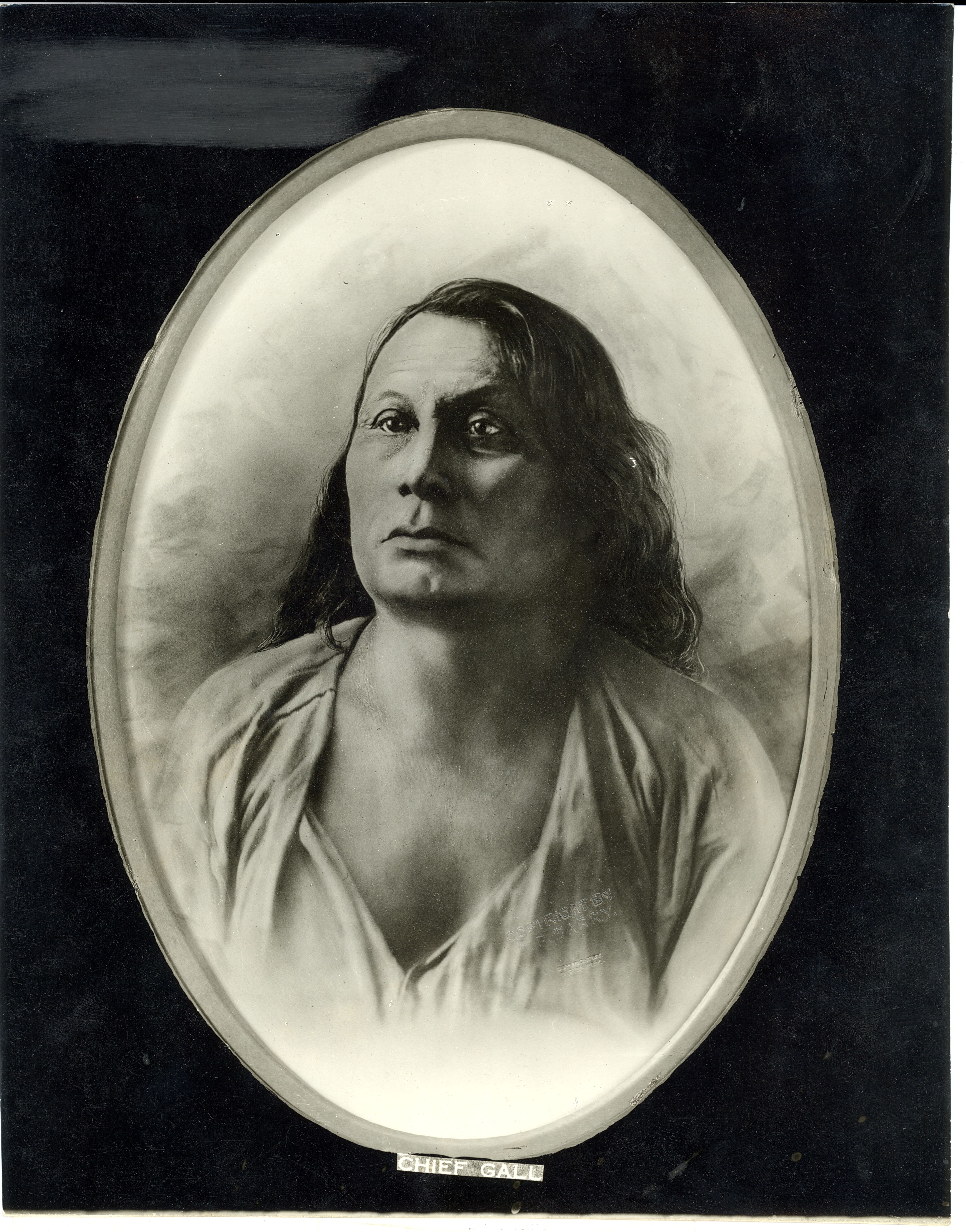 LIBI_00011_07148; A black-and-white photograph of Gall, a Hunkpapa chief, who participated in the Custer fight; copyrighted by D. F. Barry; Barry label and one-page printed biographical sketch of Gall, on the verso; created on unknown date.; PRINT, PHOTOGRAPHIC; Courtesy of the National Park Service, Little Bighorn Battlefield National Monument, LIBI_00011_07148, D. F. Barry, "Chief Gall, Bust View in Oval," date unknown