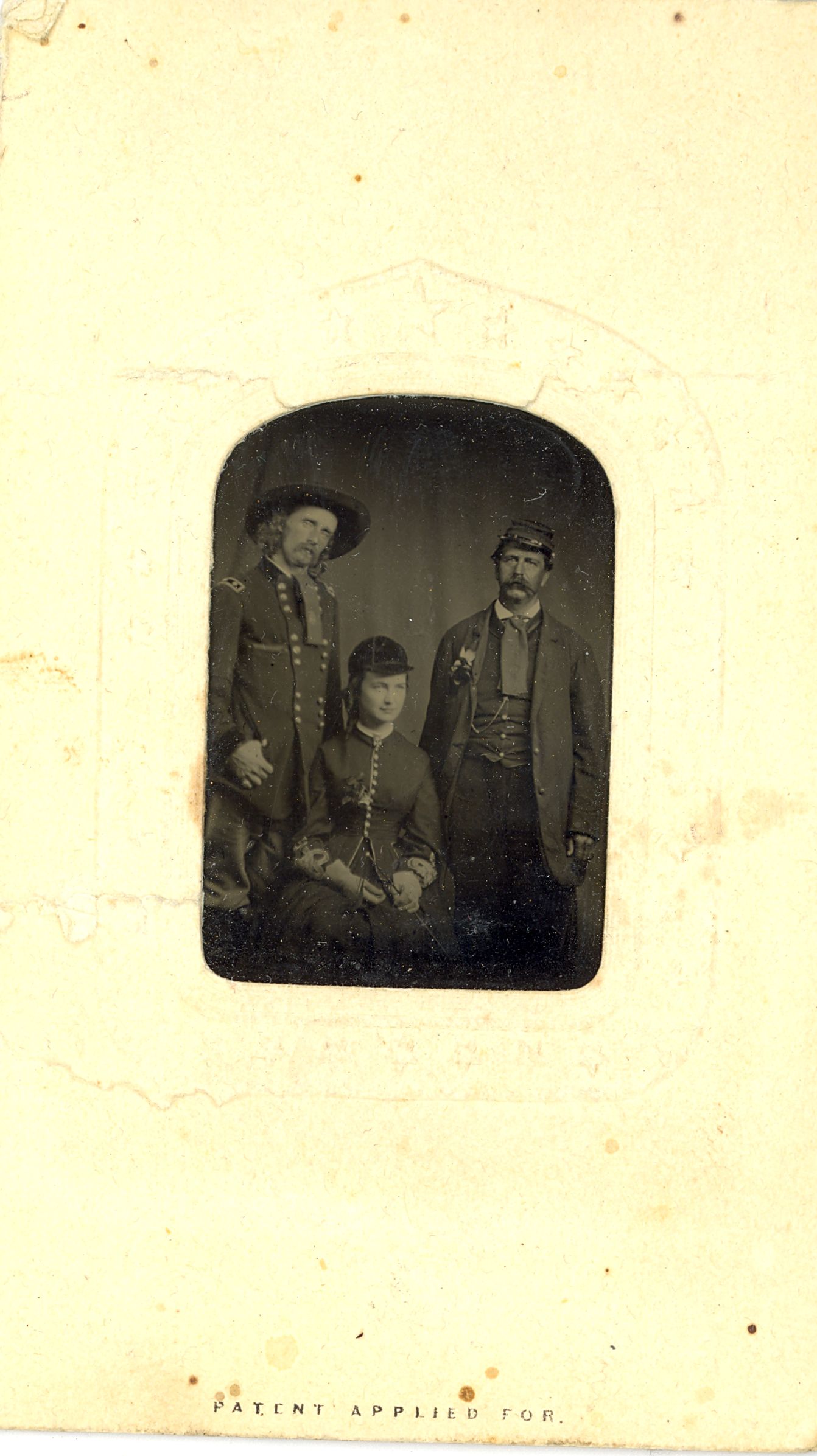 LIBI_00295_10710; A tintype in a white paper frame. The image depicts George Custer, Libbie Custer, and Jacob Greene. George Custer stands on the left. He is wearing a Brigadier General’s Uniform. He has long hair and a scarf. Libbie is seated in the center. She is wearing a uniform-style dress and riding cap. There is a slender object in her left hand. Jacob Green stands on the left. He is wearing civilian clothing with a scarf and a kepi cap. “Patent Applied For” is printed in black ink at the bottom of the frame. The image is depicted by an unknown photographer on an unknown date. ; photograph; Courtesy of the National Park Service, Little Bighorn Battlefield National Monument, LIBI_00295_10710, Unknown Photographer, "George Armstrong Custer with Long Hair, Elizabeth Bacon Custer in Riding Cap, and Jacob Greene in Civilian Clothes," date unknown