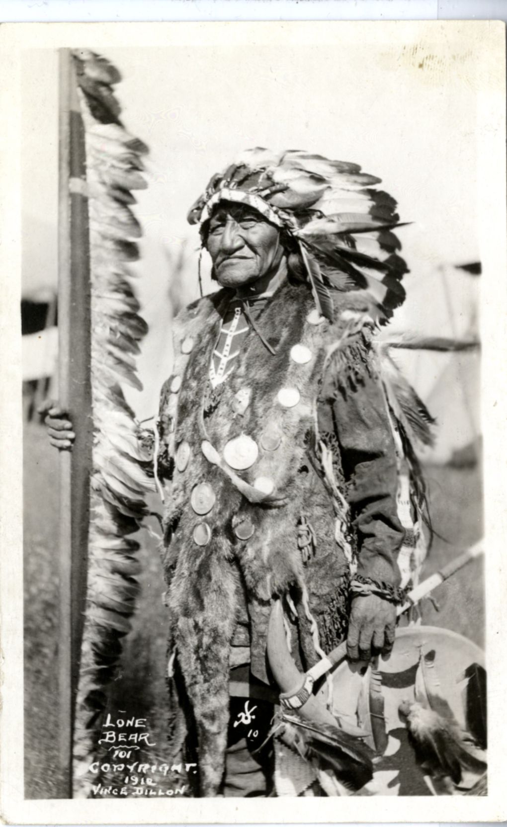 LIBI_00312_10900; A photo postcard. This image depicts Lone Bear, an Osage. He is wearing a feathered headdress and fur vest. He holds a shield and horn club in his left hand and a feathered staff in his right. White lettering on the bottom of the image reads: “Lone Bear 101 Copyright 1912 Vince Dillon”. On the verso, a stamp in black ink along the top reads: “Vince Dillon, Photos, Fairfax, OKLA” A handwritten note along the side reads: “Osage”. This image was produced by Vince Dillon in 1912. ; photo postcard;Courtesy of the National Park Service, Little Bighorn Battlefield National Monument, LIBI_00312_10900, Vince Dillon, "Lone Bear, Osage, in a Fur Vest," 1912.