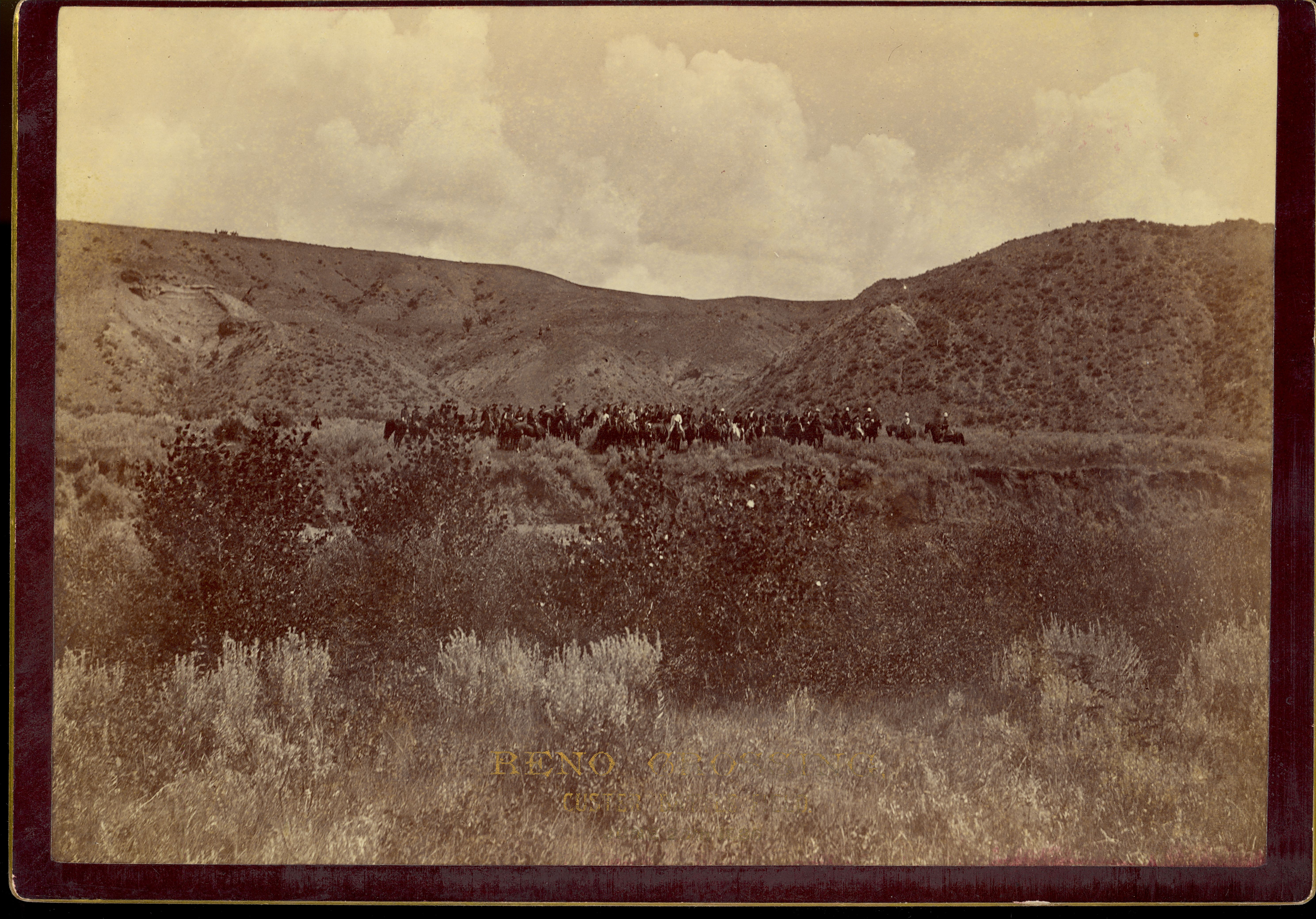 LIBI_00019_00573; This item is an original albumen, card-mounted photograph of a group on horseback at the crossing where Major Marcus Reno escaped during the Battle of Little Big Horn. The imperial view photograph is 6 1/2 x 9" (6 7/8 x 9 7/8" mounted) and was produced in 1886 by David F. Barry at the 10th anniversary of the battle. On the front, a typed notation in gold ink reads, "Reno Crossing, Custer Battlefield, June 26, 1886." On the verso, a handwritten notation in pencil reads, "Custer Battle Field June 25th 1886." Handwritten description provided by Elizabeth B. Custer. The photographer's stamp is printed in brown ink.; Print, Photographic [Mounted on Card]; Courtesy of the National Park Service, Little Bighorn Battlefield National Monument, LIBI_00019_00573, D. F. Barry, "Group Mounted on Horseback Along Reno's Crossing," June 26, 1886