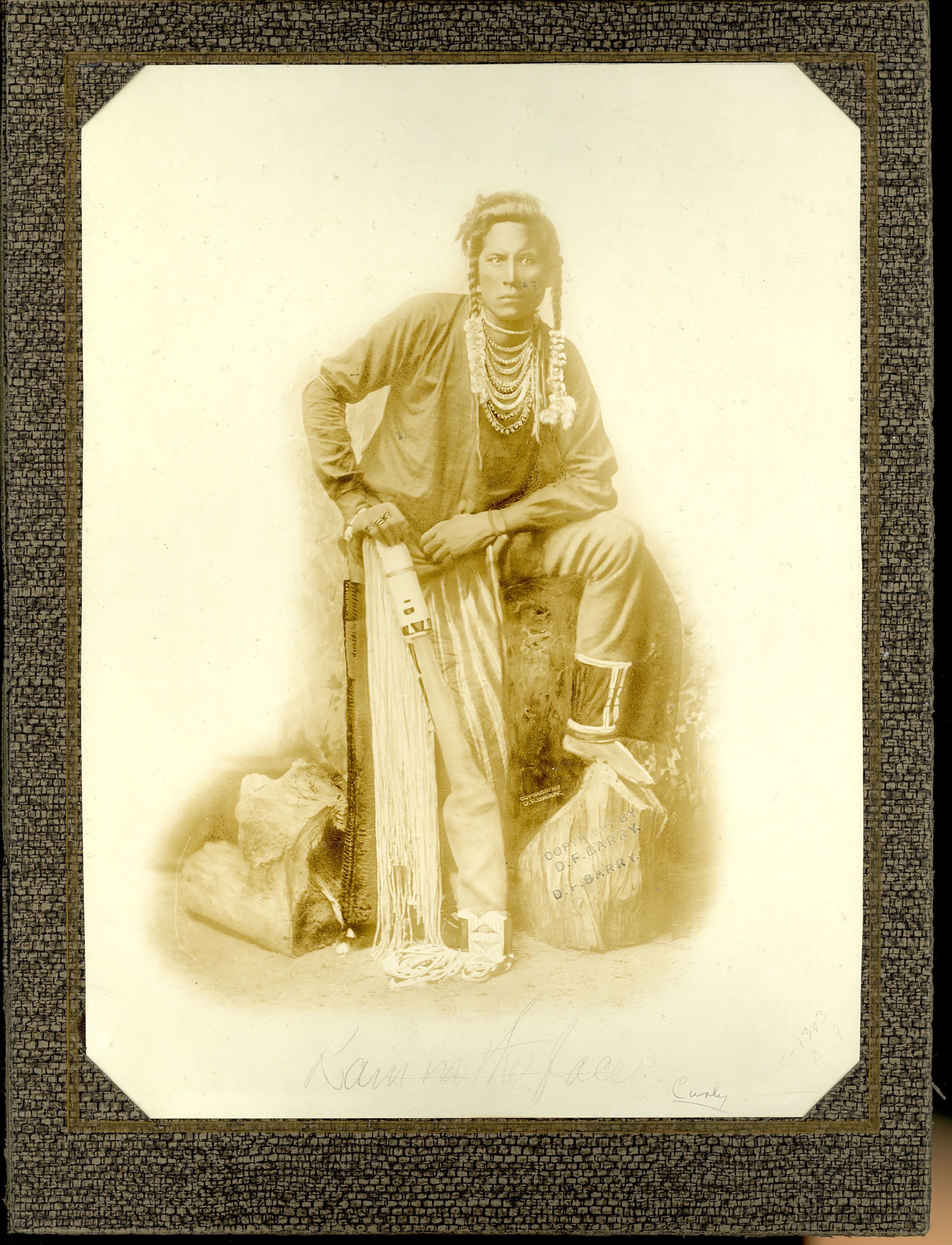 LIBI_00019_01303; This item is an albumen photograph of Curly in full view. The photograph is 7 x 9 1/2" (8 1/2 x 11" mounted in a brown folder) and produced at an unknown date by David F. Barry. On the front, "Copyright by D.F. Barry" is stamped on the lower right corner of the image. A notation in Elizabeth B. Custer's handwriting below the image reads, "Rain in the Face." "Curly" is written in the lower right corner of the photograph. The photographer's label is adhered to the verso of the folder.; PRINT, PHOTOGRAPHIC [With folder mount]; Courtesy of the National Park Service, Little Bighorn Battlefield National Monument, LIBI_00019_01303, D. F. Barry, "Curly with Wrapped Braids, Necklaces and Rings; Full View," date unknown
