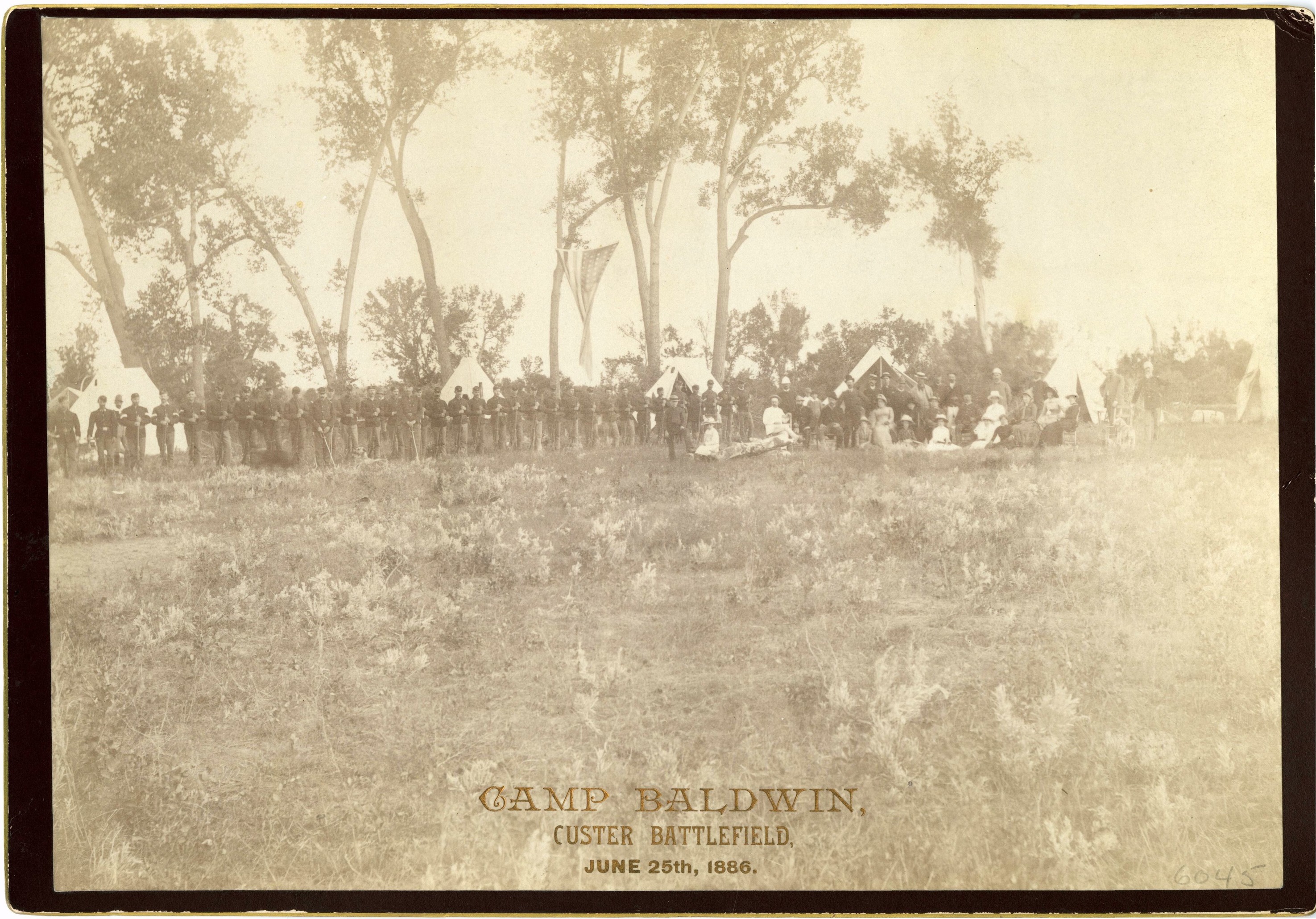 LIBI_00081_06045; Black and white photograph 6 1/2" x 9 1/4" mounted on heavy maroon cardboard with gilt-edged. Size: 7" x 10". Image shows Camp Baldwin on the Custer battlefield, June 25, 1886. There is a row of soldiers from the left to the center of the image. A group of ladies and gentlemen are seated around a tent on the right side of the image. A large American Flag is hung from a tree branch in almost the exact center of the image. The words: “Camp Baldwin, Custer Battlefield, June 25, 1886” are embossed in gold foil at the bottom of the image. It was photographed by D.F. Barry. ; picture; Courtesy of the National Park Service, Little Bighorn Battlefield National Monument, LIBI_00081_06045, D. F. Barry, "Soldiers and Civilians, Including Ladies, at Camp Baldwin on the Custer Battlefield on the 10th Anniversary," June 25, 1886
