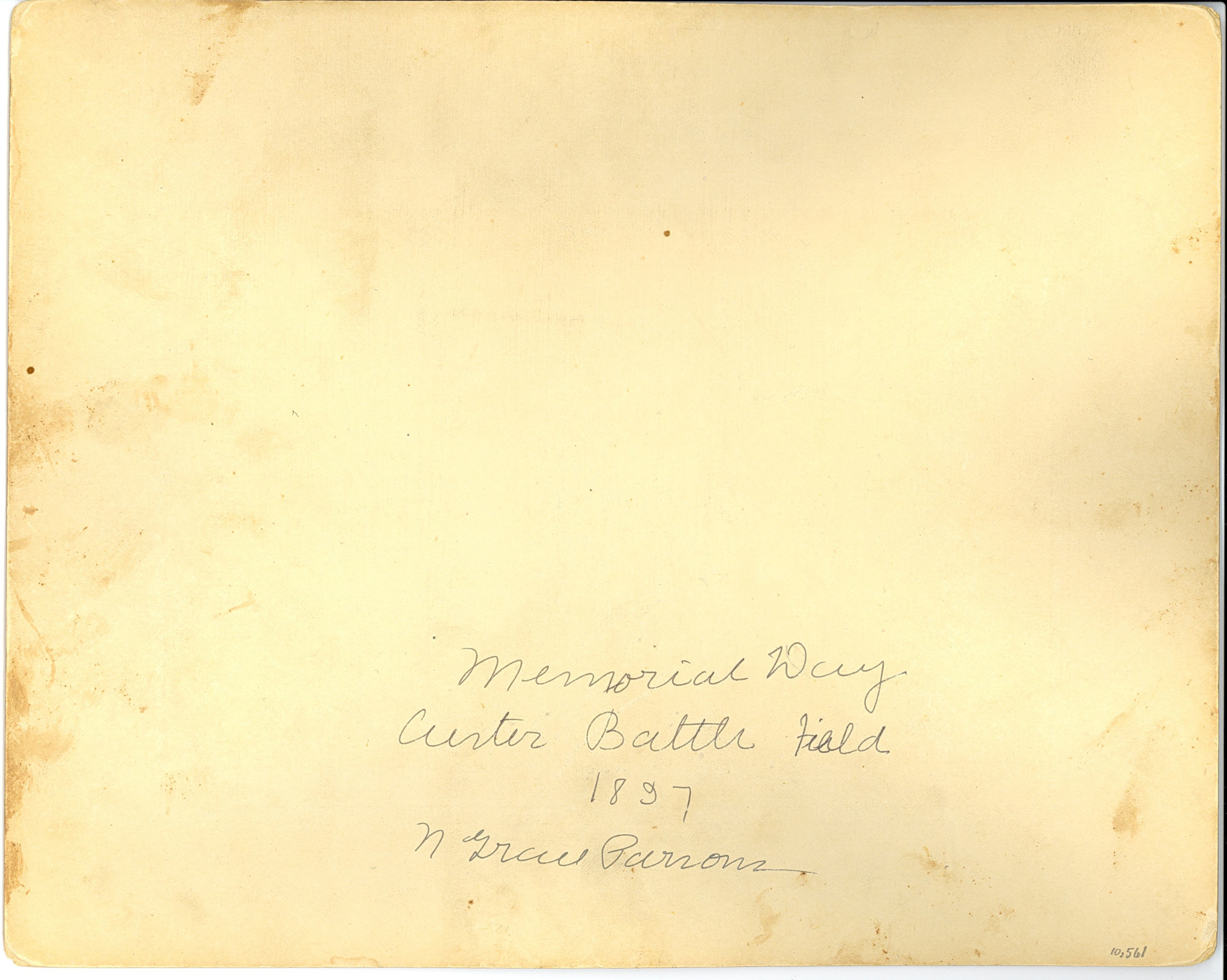 LIBI_00300_10561; A black and white photograph mounted on cardboard. This image depicts mounted soldiers and a group of citizens around the Custer memorial. There are thirteen U.S. Flags on the iron gate around the memorial. A handwritten note on verso reads: “Memorial Day Custer Battle Field 1897 N Trull [?] Parrons[?]”. This image was photographed by Mr. Krotzenberg in 1897. ; photograph; Courtesy of the National Park Service, Little Bighorn Battlefield National Monument, LIBI_00300_10561, Krotzenberg, "Mounted Soldiers Near the Custer Monument Decorated with U.S. Flags, Civilians Look On," 1897