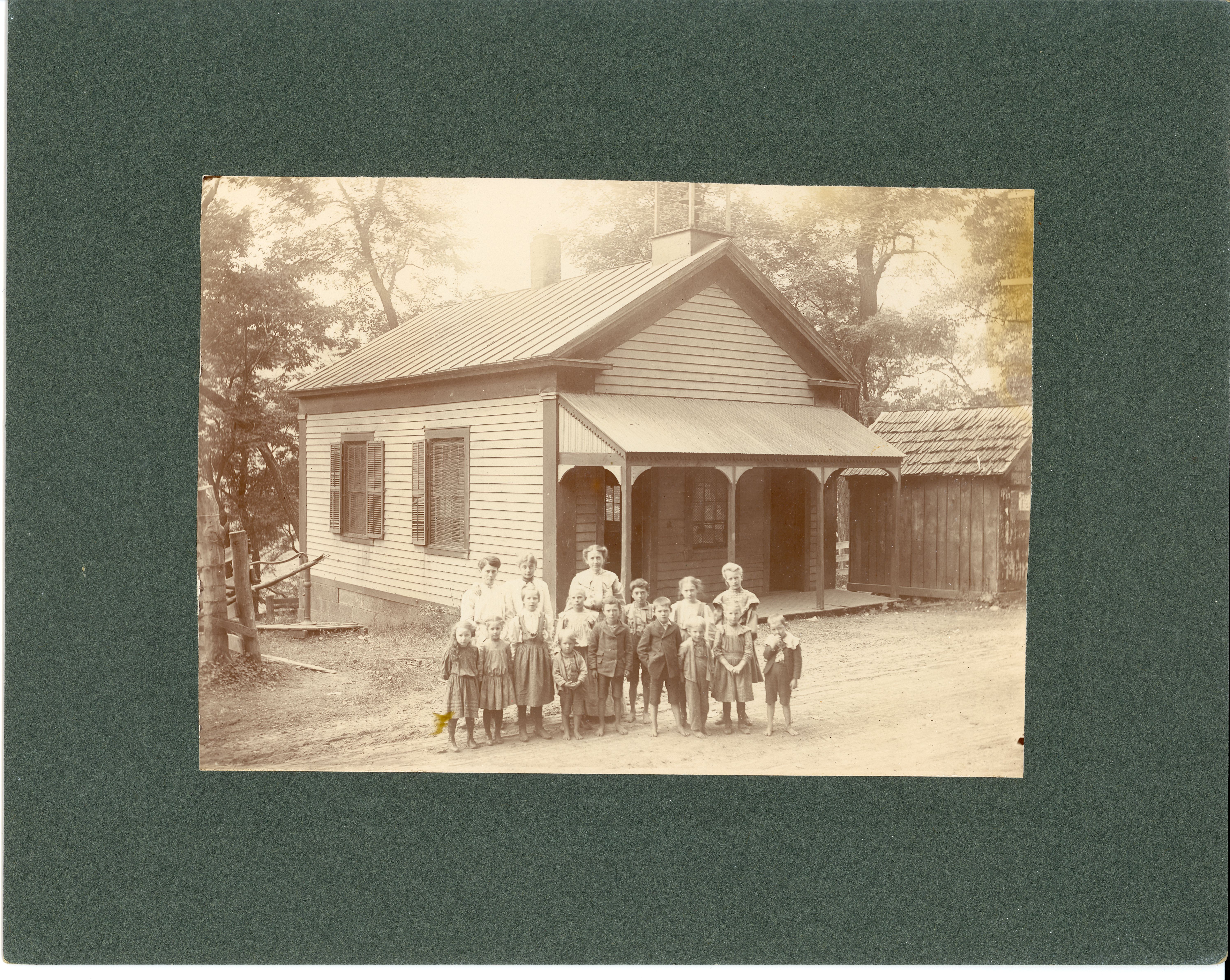 Group of 16 Children and Adults in Front of the Locust Grove Schoolhouse