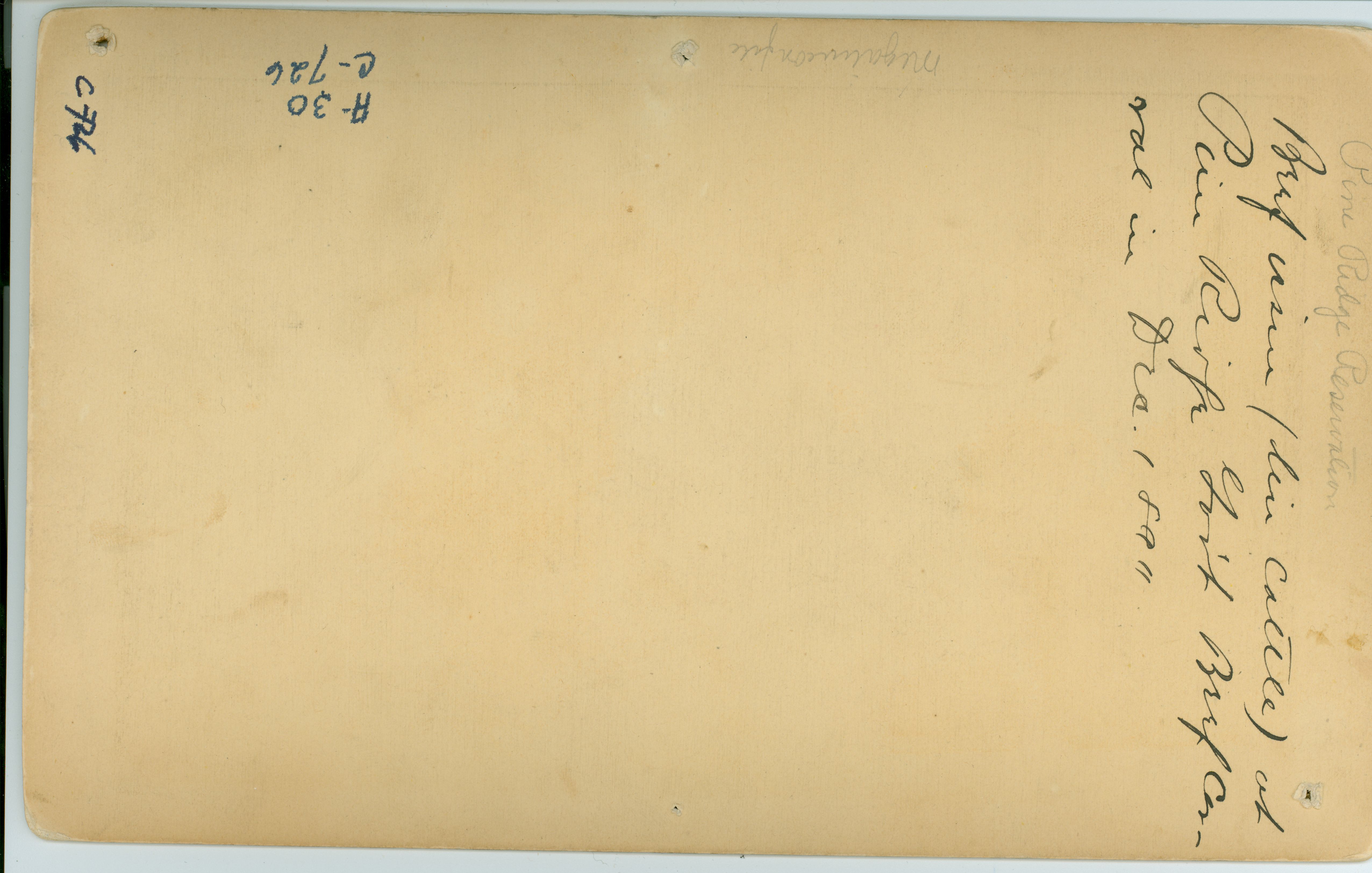 LIBI_00030_00726; An albumen photograph (mounted on card), depicting dressing a steer at the Pine Ridge Agency. A wagon with a women seated in it is at the left of the photo. Two horses are tethered to the wagon. In the foreground to the right, two Indians cutting up a steer while another seated on ground staring at picture taker. Lower right side of image reads: "No. 1504, C.G.M."; with handwritten ink notation on verso; produced by Clarence Grant Morledge, December 1891.; print, photographic; Courtesy of the National Park Service, Little Bighorn Battlefield National Monument, LIBI_00030_00726, Clarence Grant Morledge, "Butchering a Steer at the Pine Ridge Agency, South Dakota," December 1891.