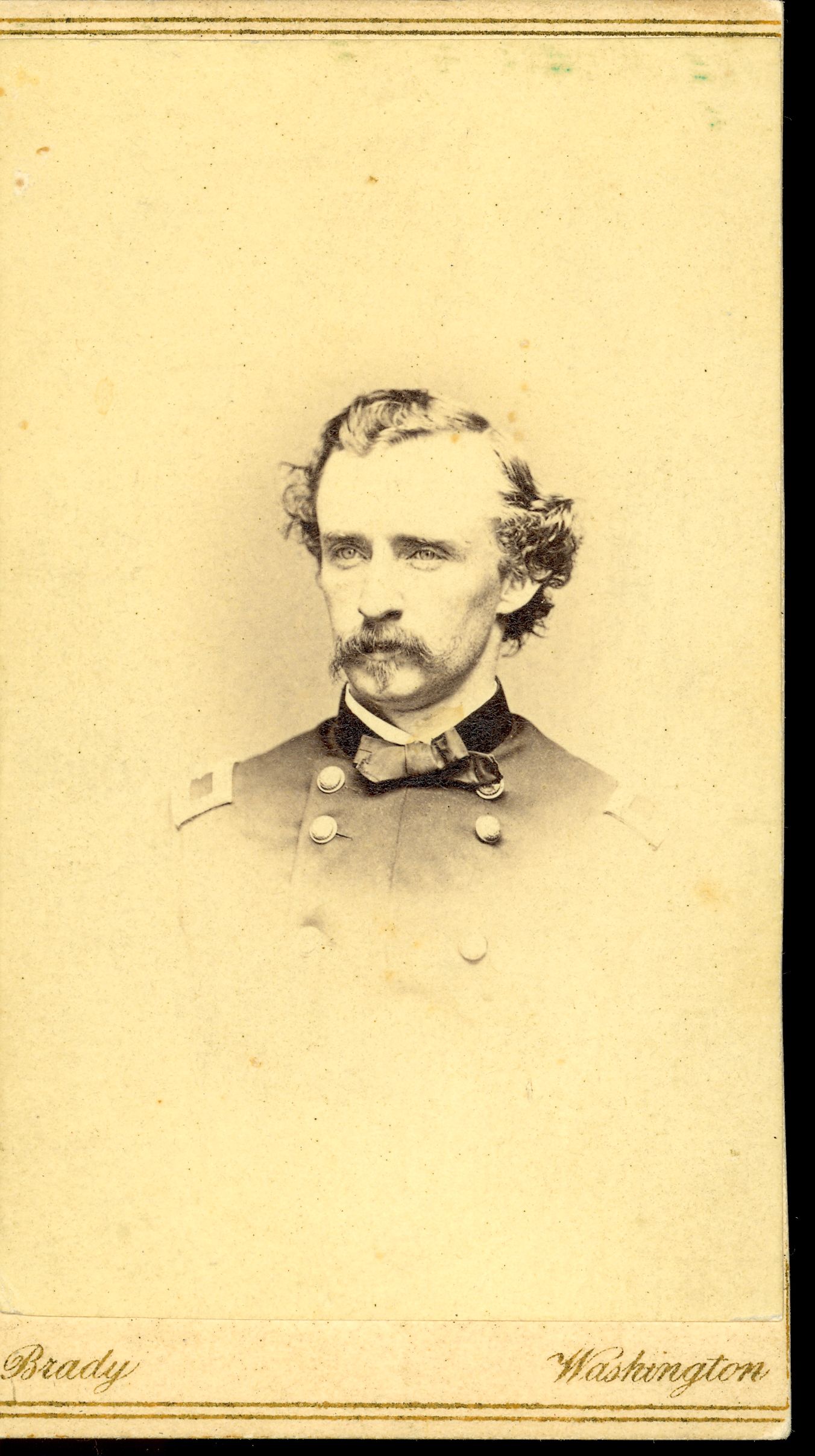 LIBI_00019_00563; This item is an albumen carte-de-visite (card-mounted photograph) of Brigadier General George A. Custer in bust view. The photograph is 2 1/8 x 3 1/2" (2 1/4 x 4" mounted). As noted on page 32 of D. Mark Katz's book, the image was produced in 1864 by Matthew Brady & Co. The photographer's stamp is printed in black ink on both the front and the verso.Photograph reprinted in "The Custer Album" by Lawrence A. Frost, page 51, and "Custer in Photographs" by D. Mark Katz, page 32.; CARTE-DE-VISITE [Card photograph]; Courtesy of the National Park Service, Little Bighorn Battlefield National Monument, LIBI_00019_00563, Mathew B. Brady & Company, "Custer in Military Uniform with Floppy Bow Tie; Bust View," 1864