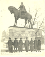 LIBI_00011_16725; A black-and-white photograph of a 7th cavalry reuniting partying at Custer Monument in Monroe, Michigan, dated February 15, 1920; a handwritten ink notation is apparent on the verso; created by unknown photographer.; PRINT, PHOTOGRAPHIC; Courtesy of the National Park Service, Little Bighorn Battlefield National Monument, LIBI_00011_16725, Unknown Photographer, "7th Cavalry Reunion, Monroe Michigan," February 15, 1920