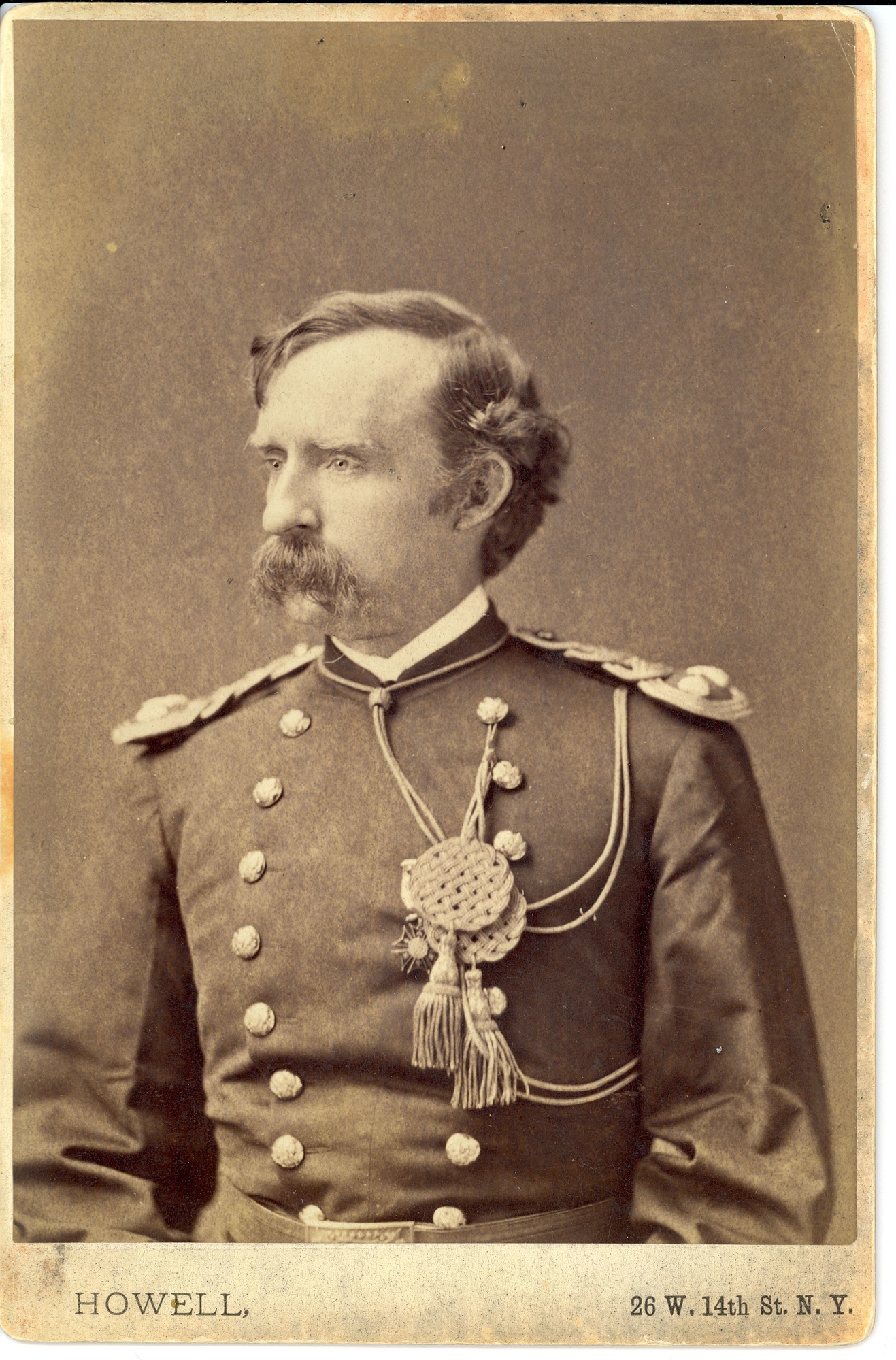 LIBI_00019_00883; This item is an albumen cabinet card (card-mounted photograph) of Lieutenant Colonel George A. Custer in waist bust view and wearing his military uniform. The photograph is 4 x 5 7/8" (4 1/4 x 6 1/2" mounted). As noted on page 137 of D. Mark Katz's book, the image was produced in 1876 by William R. Howell of New York. The photographer's stamp is printed on the front of the cabinet card. Also see catalog number 335. This item was formerly copy 2 of catalog number 332.Note: Severe foxing on the mount, and image degradation is evident.Photograph reprinted in "The Custer Album" by Lawrence A. Frost, page 165, and "Custer in Photographs" by D. Mark Katz, page 137.; Cabinet Card [Card Photograph]; Courtesy of the National Park Service, Little Bighorn Battlefield National Monument, LIBI_00019_00883, William Frank Browne, "Lieutenant Colonel George Armstrong Custer in Dress Uniform; Waist Bust View," 1876