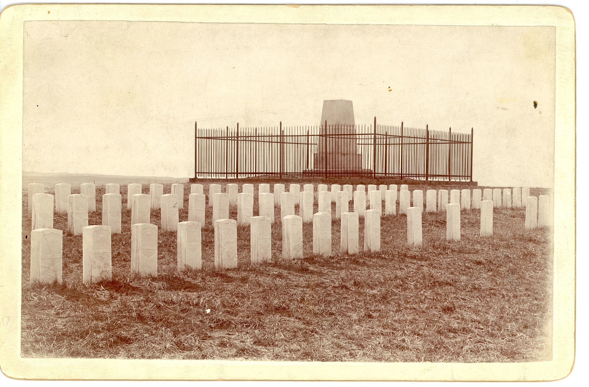 Courtesy of the National Park Service, Little Bighorn Battlefield National Monument, LIBI_00300_10573, Krotzenberg, "Rows of Headstones Near the Custer Monument," 1897