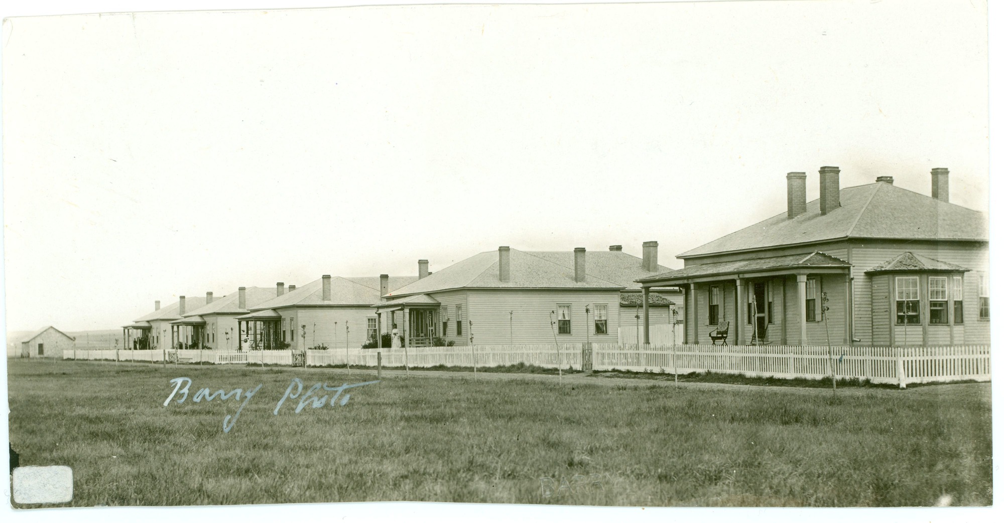 LIBI_00030_00739; A black-an-white photograph depicting the view of officers' row. D. H. Brotherton's quarters are at the extreme right. Handwritten pencil notation on verso reads “House on extreme right- quarters of May- D.H. Brotherton-where I was a vistor at time of Sitting Bull’s surrender”. Produced by D. F. Barry, on an unknown date.; print, photographic; Courtesy of the National Park Service, Little Bighorn Battlefield National Monument, LIBI_00030_00739, D. F. Barry, "Officers' Row," date unknown.