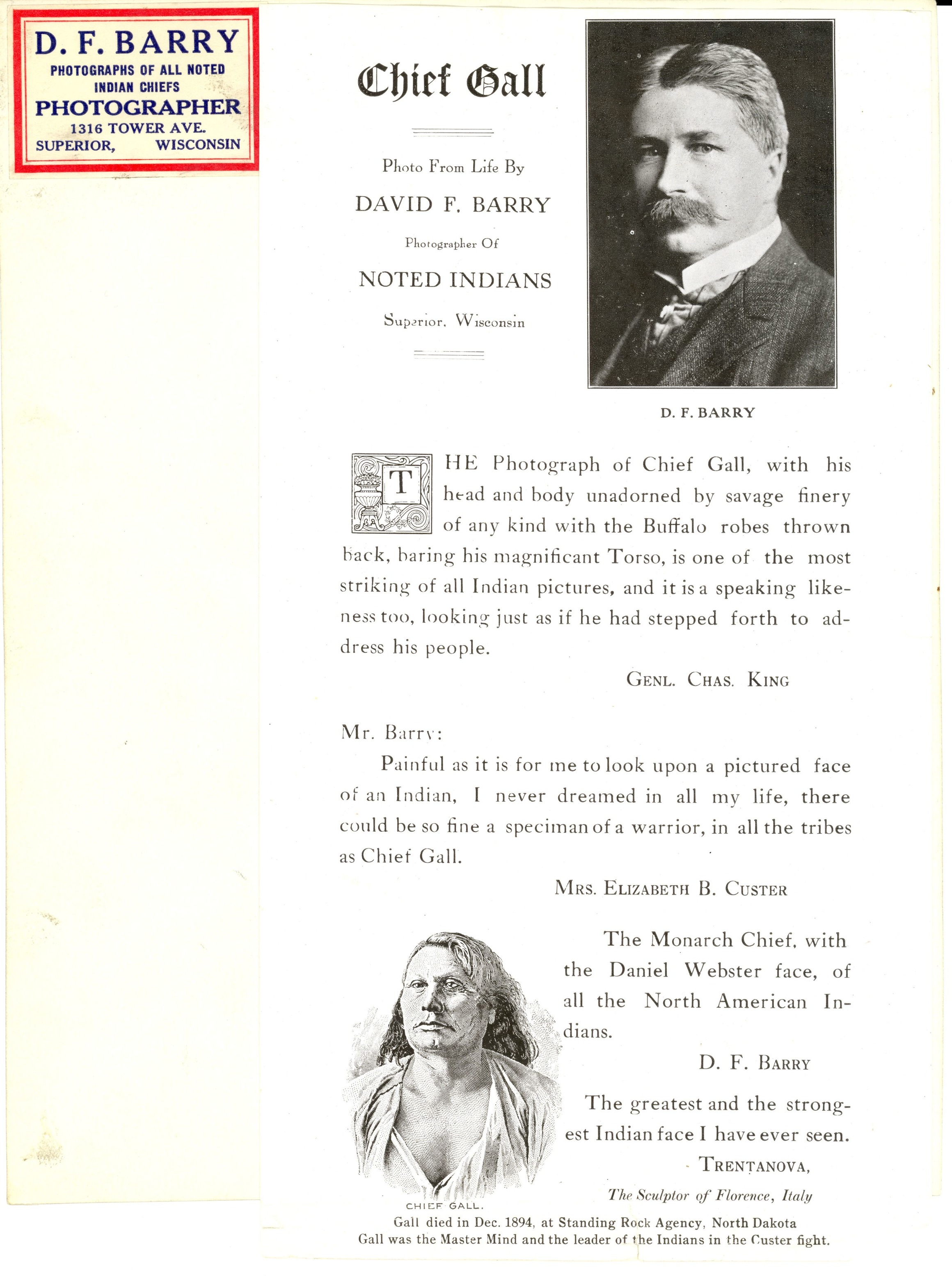 LIBI_00011_07148; A black-and-white photograph of Gall, a Hunkpapa chief, who participated in the Custer fight; copyrighted by D. F. Barry; Barry label and one-page printed biographical sketch of Gall, on the verso; created on unknown date.; PRINT, PHOTOGRAPHIC; Courtesy of the National Park Service, Little Bighorn Battlefield National Monument, LIBI_00011_07148, D. F. Barry, "Chief Gall, Bust View in Oval," date unknown