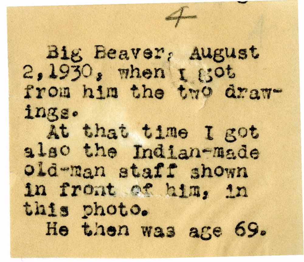 LIBI_00012_07921; A black-and-white photograph of Big Beaver, sitting in front of a tent and holding up two pieces of his art work. Produced by Dr. Thomas Marquis, dated circa 1930. Enclosed with print is a single sheet typed explanation of the picture which was typed by Dr. Marquis accompanying the photograph. In good condition. ; print, photographic ; Courtesy of the National Park Service, Little Bighorn Battlefield National Monument, LIBI_00012_07921, Thomas B. Marquis, "Big Beaver Seated in Front of a Tent Holding Two Pieces of His Artwork," circa 1930