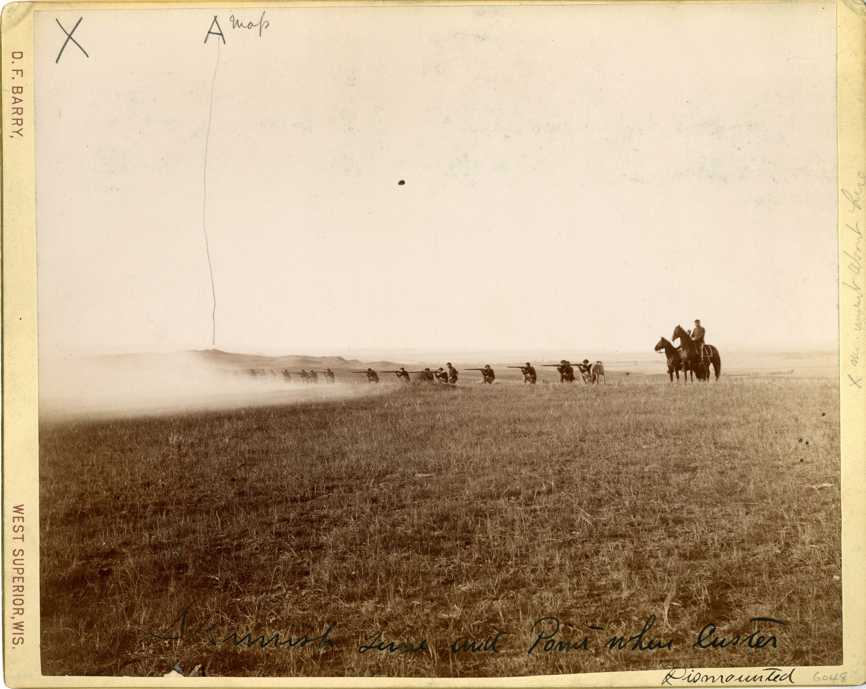 LIBI_00081_06048; Black and white photograph 7 3/4" x 9" mounted on heavy white cardboard. Total size: 8' x 10'; Image depicts a skirmish line with guns in firing position. A cloud of smoke passes in front of some of the men. Two men are mounted at the right side of the picture. A handwritten notation along the bottom of the image reads: Skirmish Line and Point where Custer Dismounted” Handwritten notation in ink on verso reads: “Skirmish Line Custer Battlefield and Point Where Custer Dismounted”. Image produced by D.F. Barry.Dustin number: 285; picture; Courtesy of the National Park Service, Little Bighorn Battlefield National Monument, LIBI_00081_06048, D. F. Barry, "Skirmish Line at the Point Where Custer Dismounted on the Battlefield," date unknown