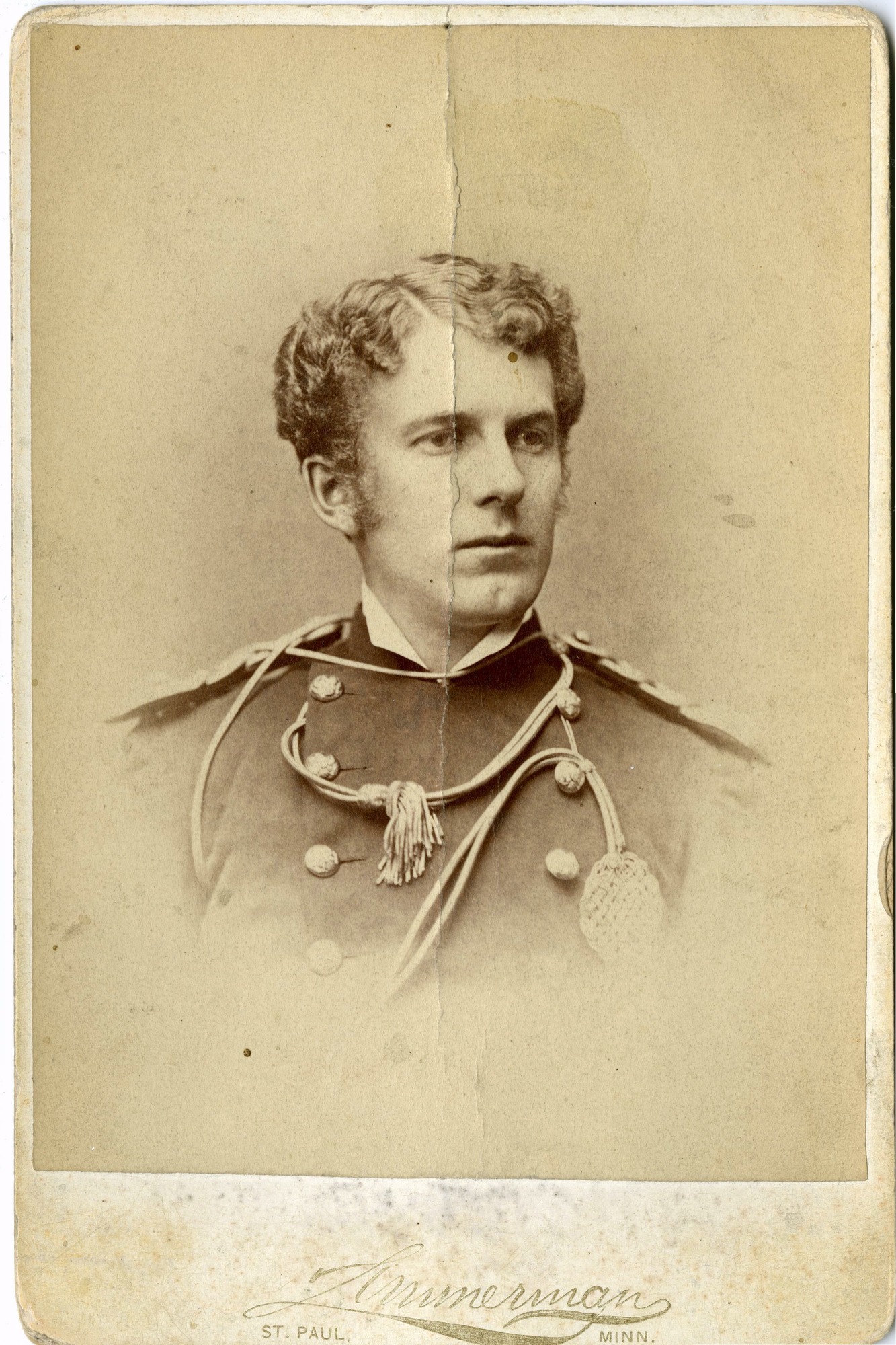 LIBI_00015_00657; An albumen cabinet card (card photograph) of Edward Brewer in dress uniform, in bust view; studio portrait produced by Zimmerman studio, circa 1880. This item has a prominent crack down middle; is yellowing; with foxing on mount and print.; cabinet card [card photograph];Courtesy of the National Park Service, Little Bighorn Battlefield National Monument, LIBI_00015_00657, Zimmerman Studio, "Bust View of Edward Brewer in Dress Uniform," circa 1880