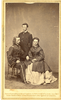 LIBI_00295_10697; Albumen photo pasted on card. The card has a double-line gold border. This image depicts George seated on the left; Tom standing in the center; and Libbie seated on the right. George is wearing a major general uniform, hat folded on lap with right hand. His left arm is on the arm of the chair. His hand is over Libbie's lap. He faces Libbie. Tom is wearing a second Lieutenant Uniform. He is looking to the right of the camera. Libbie is wearing a white skirt; a dark top with no collar and ribbon ties. Her hair is half curled and pulled back. Her hands are folded on her lap. There is printing at bottom in gold that reads: “Entered according to Act of Congress by M.B. Brady & Co. in the year 1865 in the Clerk’s Office of the District Court of the District of Columbia. The verso is stamped with Brady's National Photo Portrait Galleries. There are two inscriptions: a pencil notation along the top and an ink notation written side-ways along the center. This image was created by Mathew Brady, cir