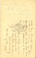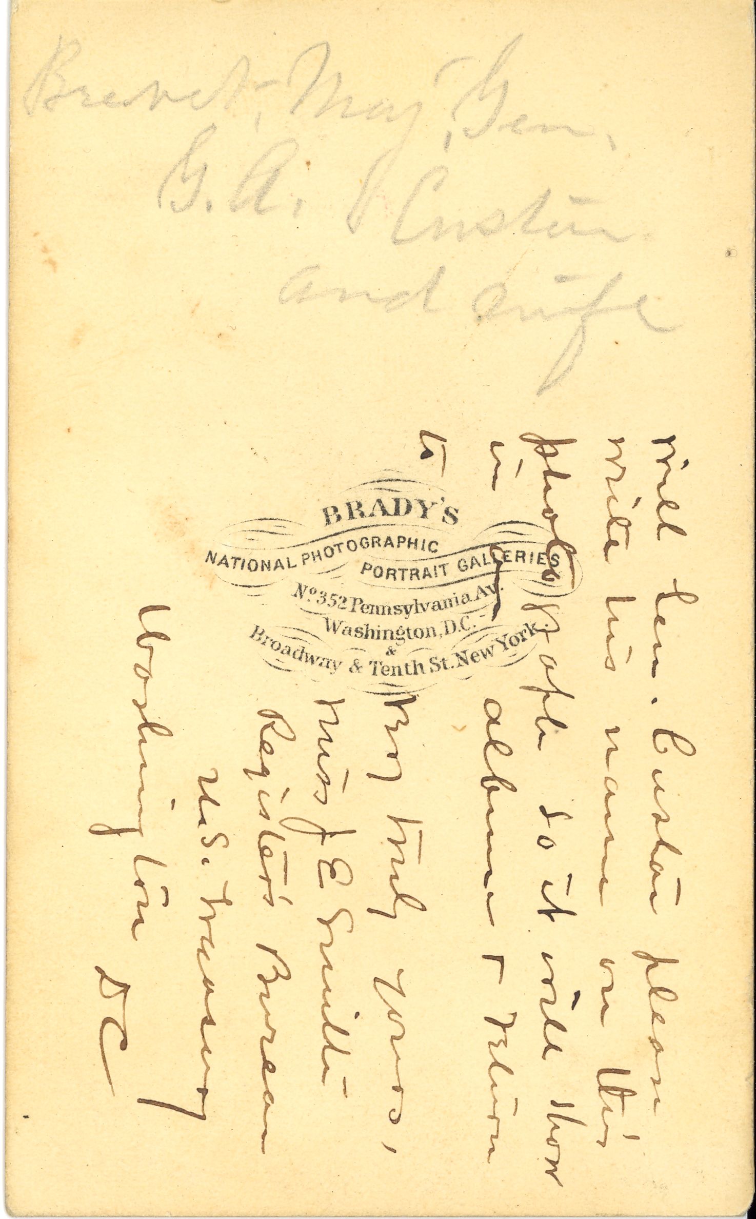 LIBI_00295_10697; Albumen photo pasted on card. The card has a double-line gold border. This image depicts George seated on the left; Tom standing in the center; and Libbie seated on the right. George is wearing a major general uniform, hat folded on lap with right hand. His left arm is on the arm of the chair. His hand is over Libbie's lap. He faces Libbie. Tom is wearing a second Lieutenant Uniform. He is looking to the right of the camera. Libbie is wearing a white skirt; a dark top with no collar and ribbon ties. Her hair is half curled and pulled back. Her hands are folded on her lap. There is printing at bottom in gold that reads: “Entered according to Act of Congress by M.B. Brady & Co. in the year 1865 in the Clerk’s Office of the District Court of the District of Columbia. The verso is stamped with Brady's National Photo Portrait Galleries. There are two inscriptions: a pencil notation along the top and an ink notation written side-ways along the center. This image was created by Mathew Brady, cir