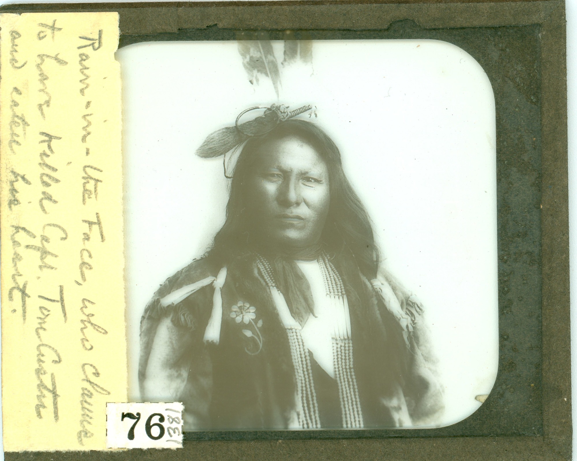 LIBI_00030_01381; A lantern-slide (glass transparency), "Rain in the Face," This is a bust view of Rain in Face in traditional dress with two feathers in his hair. A handwritten pencil notation along the side reads: “Rain-in-the Face, who claims to have killed Capt. Tom Custer and eaten his heart.” It was produced by an unknown photographer on an unknown date. [Bowen No. 76.]; transparency, latern-slide [photographic material]; Courtesy of the National Park Service, Little Bighorn Battlefield National Monument, LIBI_00030_01381, Unknown Photographer, "Rain in the Face Wearing Traditional Dress with Two Feathers in His Hair," date unknown