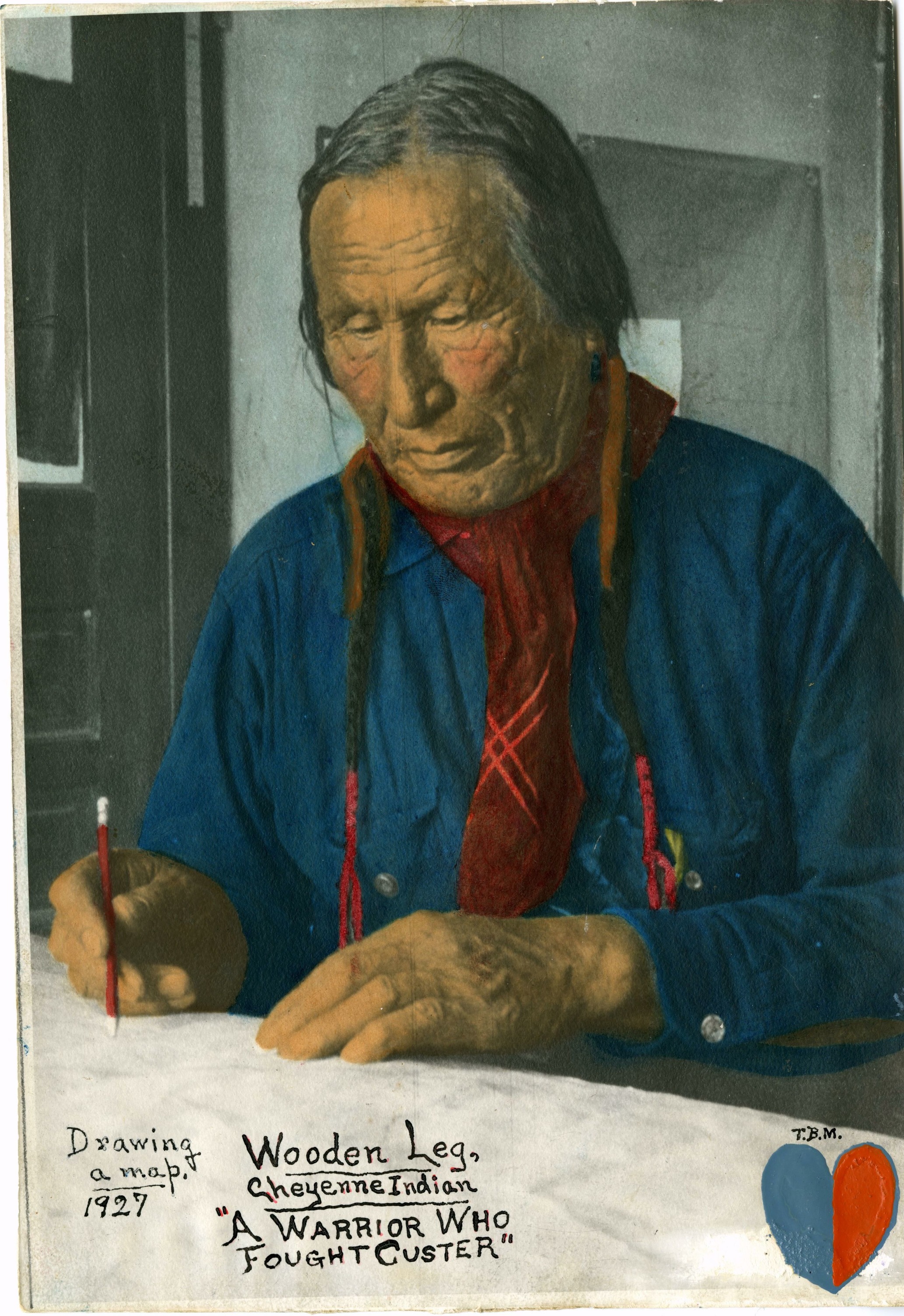 LIBI_00012_01922; A hand-tinted photograph of Wooden Leg seated drawing a map; produced by Dr. Marquis, circa 1927; removed from frame - "April, 1972. Copy 2 in box 4, shelf D, row 2".; print, photographic; Courtesy of the National Park Service, Little Bighorn Battlefield National Monument, LIBI_00012_01922, Thomas B. Marquis, "Wooden Leg, Seated, Drawing a Map," circa 1927