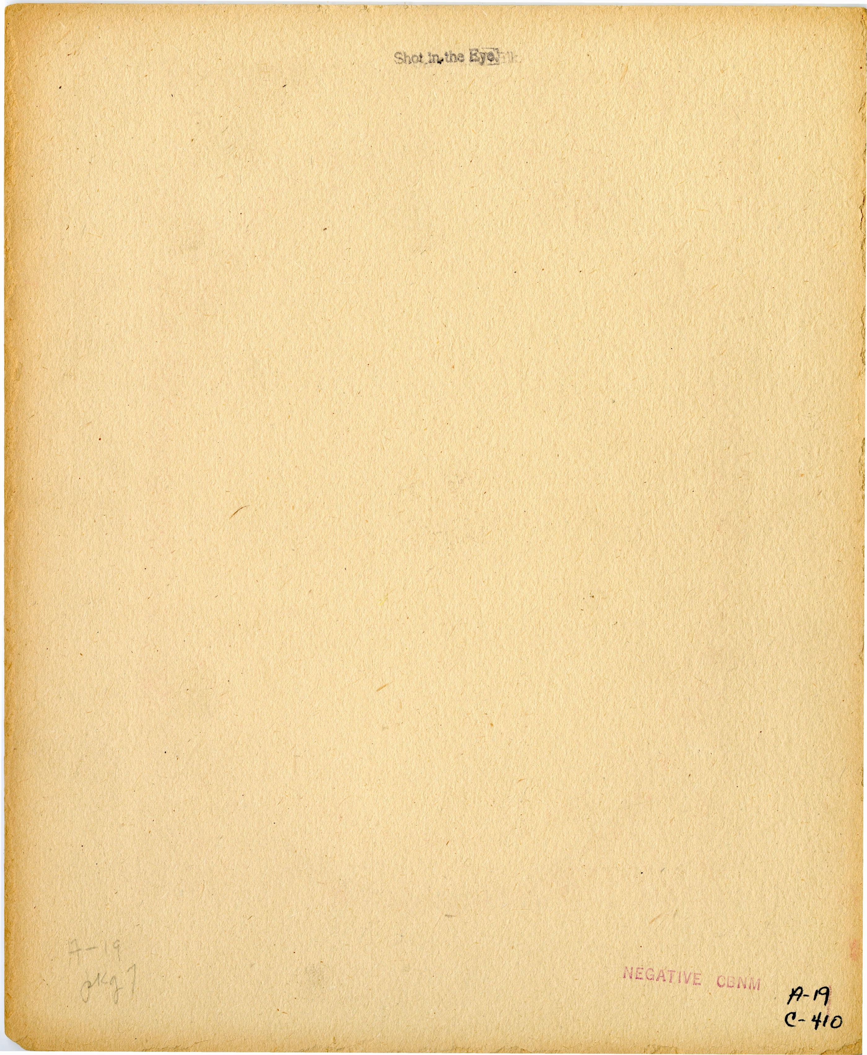 A color, offset lithograph print with grey mat; depicts a Sioux warrior Shot in the Eye, originally in the Battle of Little Bighorn; by unknown artist; created on unknown date.