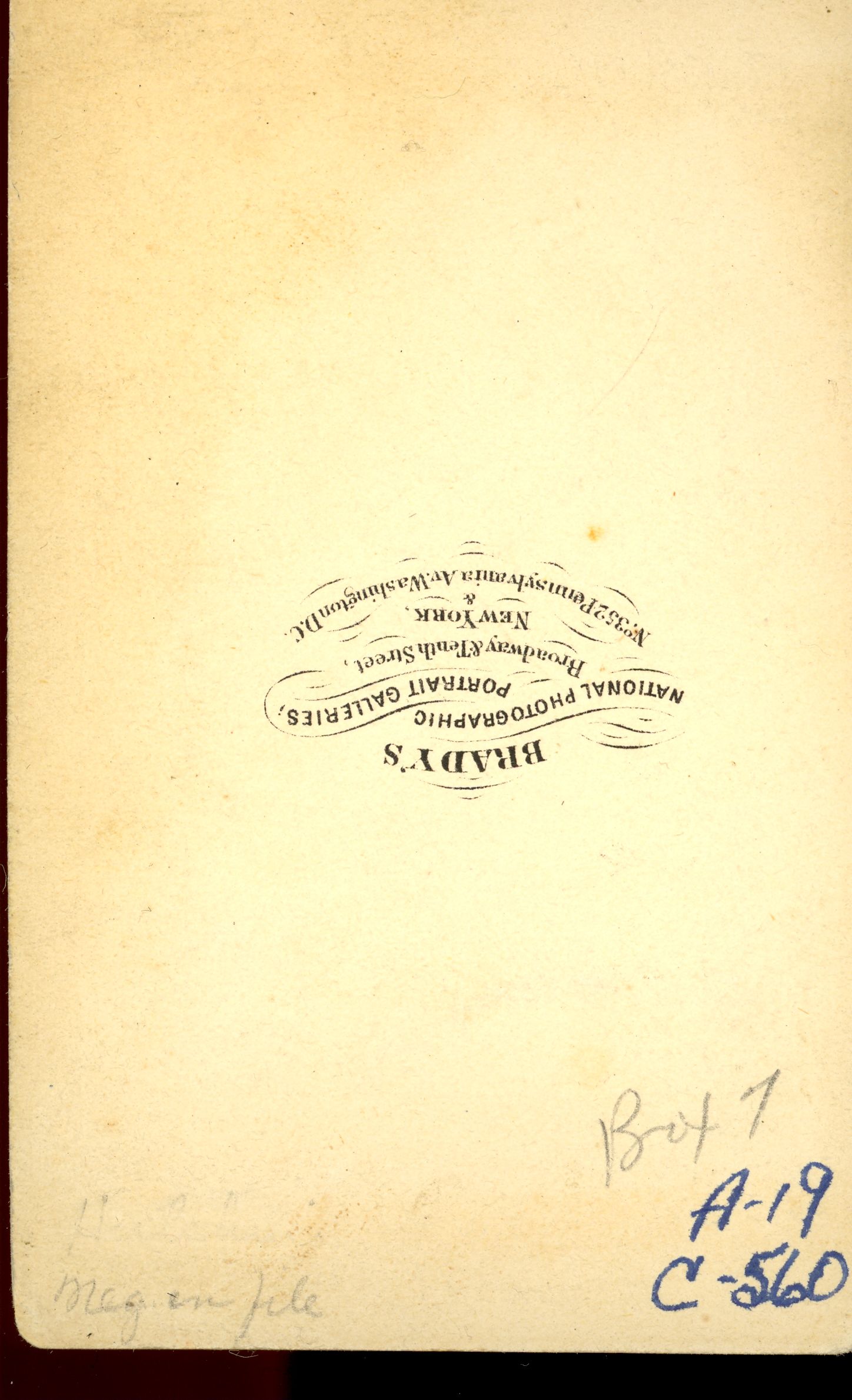 LIBI_00019_00560; This item is an albumen carte-de-visite (card-mounted photograph) of Brigadier General George A. Custer in long bust view and wearing his military uniform. The photograph is 2 x 3 1/4" (2 3/8 x 4" mounted). As noted on page 25 of D. Mark Katz's book, the photograph was produced circa 1864 by Matthew B. Brady. The image is mounted upside down on the card and is poorly trimmed. The photographer's stamp is printed on the verso.Note: "Box 7" handwritten on the verso. Photograph reprinted in "Custer in Photographs" by D. Mark Katz, page 25.; CARTE-DE-VISITE [Card photograph]; Courtesy of the National Park Service, Little Bighorn Battlefield National Monument, LIBI_00019_00560, Mathew B. Brady, "Brigadier General George Armstrong Custer Wearing Military Uniform with Shoulder Insignia Visible, Seated in Long Bust View Facing Left," circa 1864