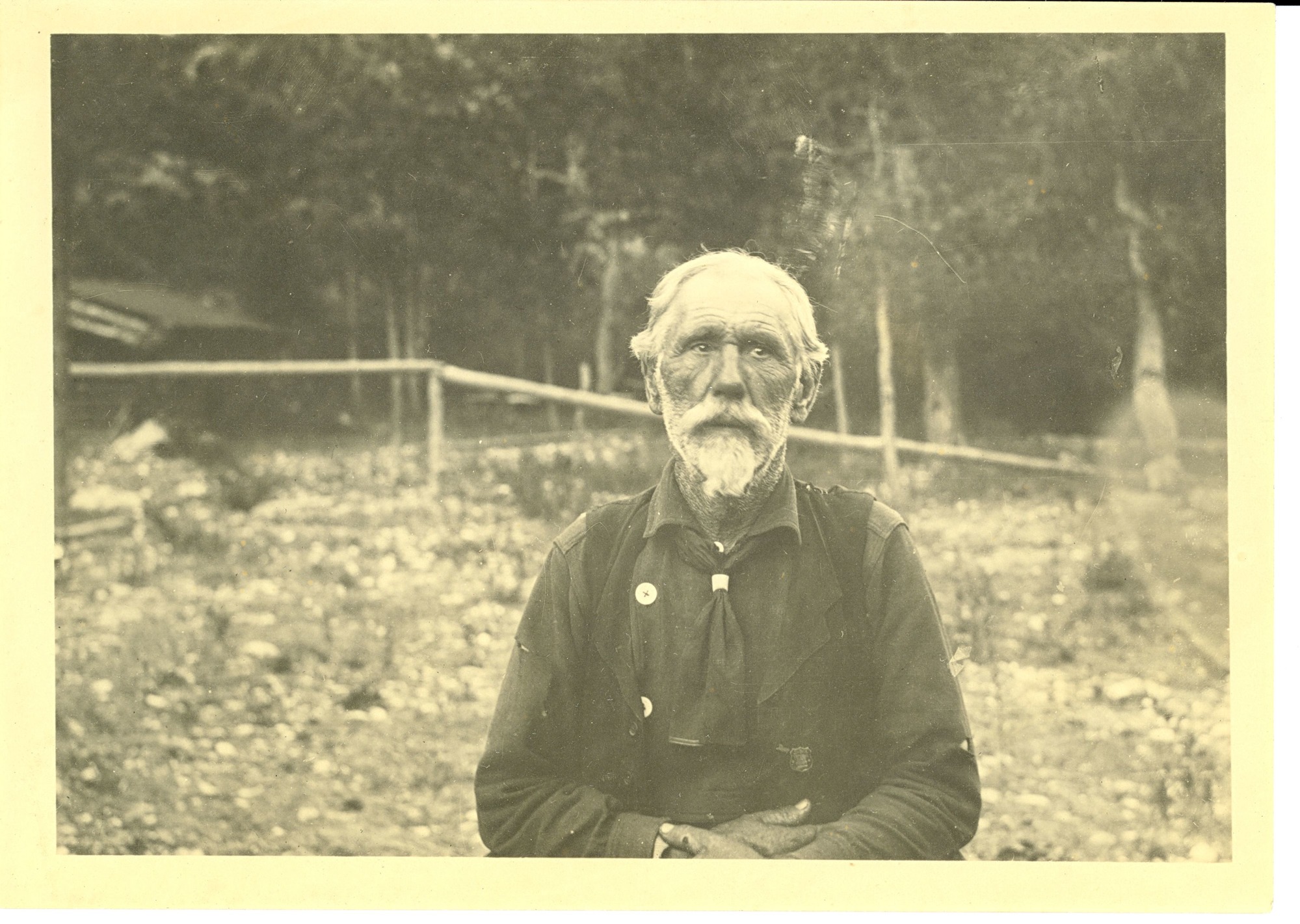 LIBI_00312_11149; Print photograph. This image Depicts Tom LaForge in dark shirt and vest. He has white hair and van dyke facial hair. He appears to have been photographed outside. A building is visible in the background. A handwritten note on the verso reads: “Tom LaForge One of Custers Scouts”. LaForge was with Gibbon’s column. This image was created by an unknown photographer, circa 1920. ; print;Courtesy of the National Park Service, Little Bighorn Battlefield National Monument, LIBI_00312_11149, Unknown Photographer, "Elderly Thomas LaForge," circa 1920.