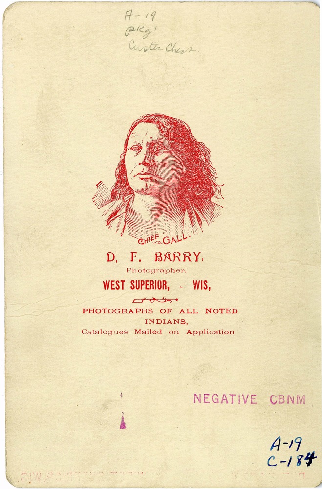 LIBI_00019_00184; This item is an albumen cabinet card (card-mounted photograph) of Bull Head, who killed Sitting Bull, in full regalia and holding a pipe. The studio portrait is 3 3/4 x 5 1/2" (4 1/4 x 6 1/2" mounted) and was produced circa 1878 by David F. Barry. A label adhered to the front of the card reads, "Bull Head" and a handwritten notation in black ink reads, "Killed Sitting Bull." The photographer's stamp is embossed in red ink on the front of the card. On the verso, there is a drawing of Chief Gall and the photographer's stamp printed in red ink.Note: "Pkg I/Custer Chest" handwritten on verso.; CABINET CARD [Card photograph]; Courtesy of the National Park Service, Little Bighorn Battlefield National Monument, LIBI_00019_00184, D. F. Barry, "Bull Head in Full Regalia and Holding a Pipe," circa 1878