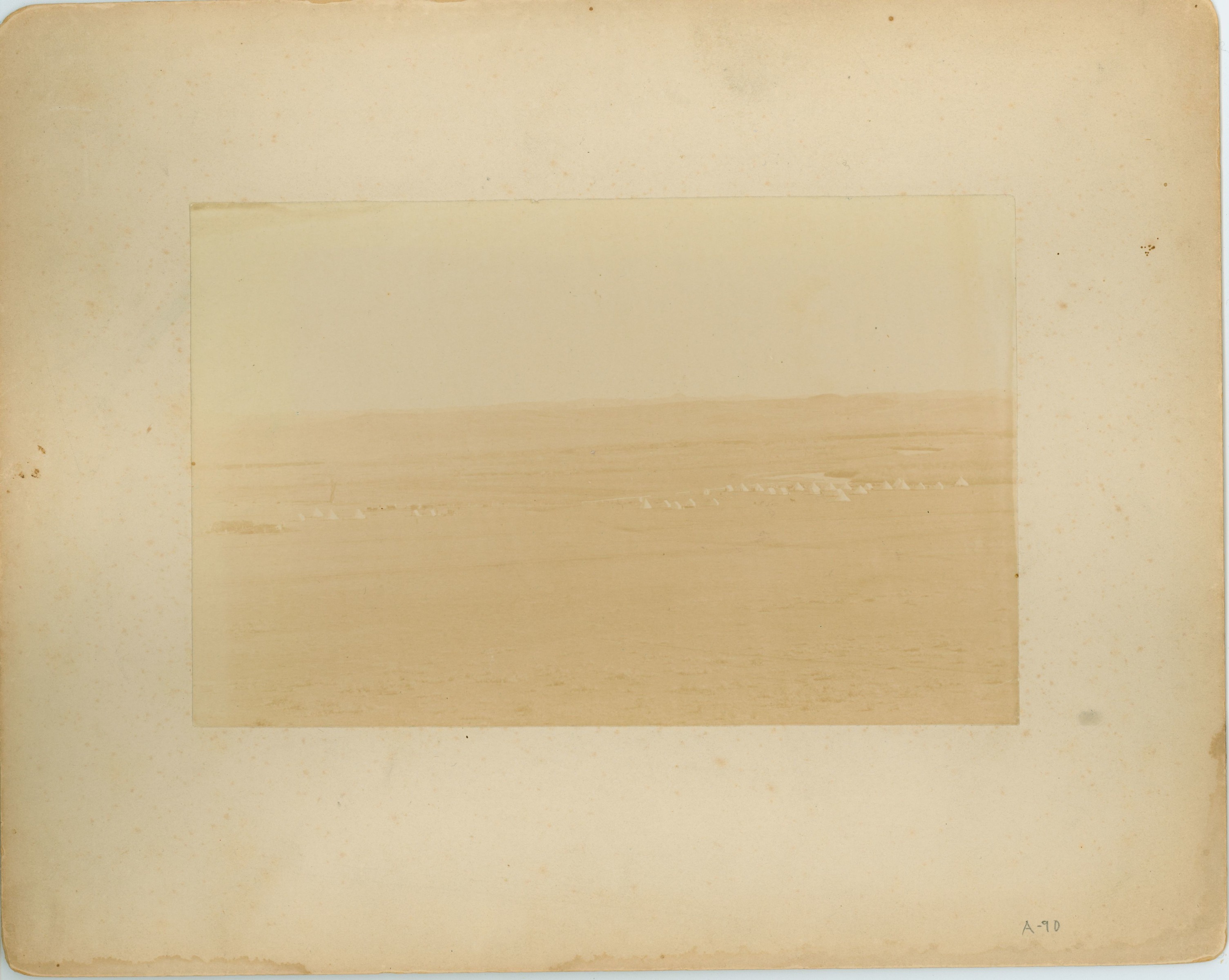 LIBI_00090_05179; An albumen photograph of unidentified camp of tipis with an army post in background. This may be Fort Custer. The image is mounted on card. It is yellowing and faded. It was produced by an unknown photographer on an unknown date.; print, photographic [mounted on card]; Courtesy of the National Park Service, Little Bighorn Battlefield National Monument, LIBI_00090_05179, Unknown Photographer, "An Unidentified Camp of Tipis with an Army Post in the Background," date unknown