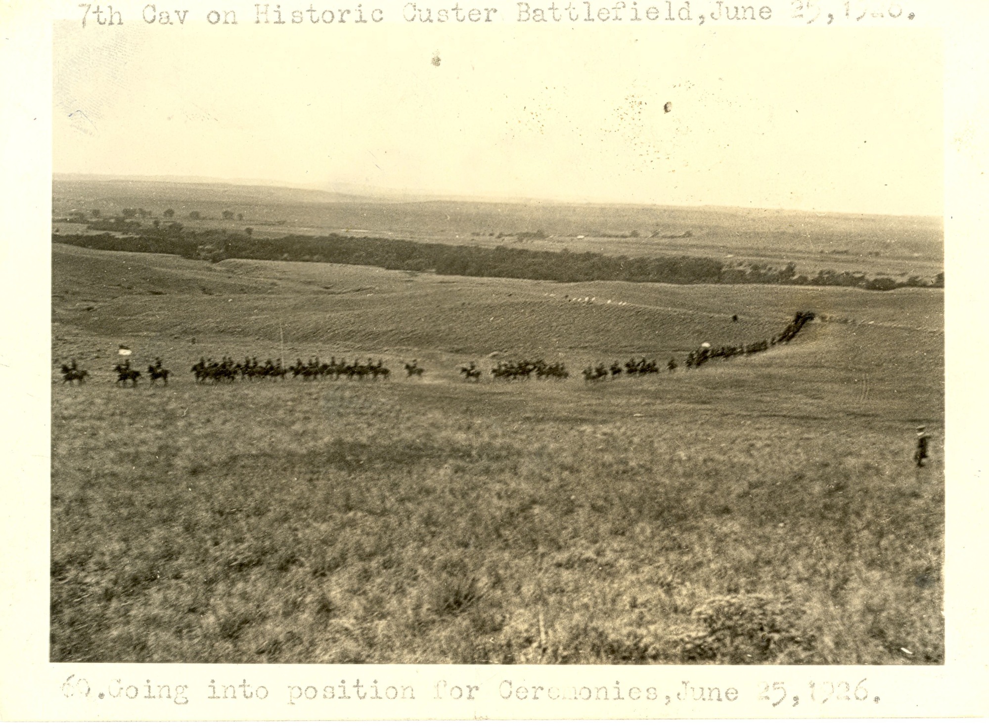 LIBI_00011_07180; A sepia-toned photograph of 50th Anniversary Ceremonies; typewritten notation on white border reads, "7th cav. on historic Custer battlefield, June 25, 1929/ 60. Going into position for ceremonies, June 25, 1926"; by unknown photographer.; PRINT, PHOTOGRAPHIC; Courtesy of the National Park Service, Little Bighorn Battlefield National Monument, LIBI_00011_07180, Unknown Photographer, "7th Cavalry on Historic Custer Battlefield," June 25, 1926