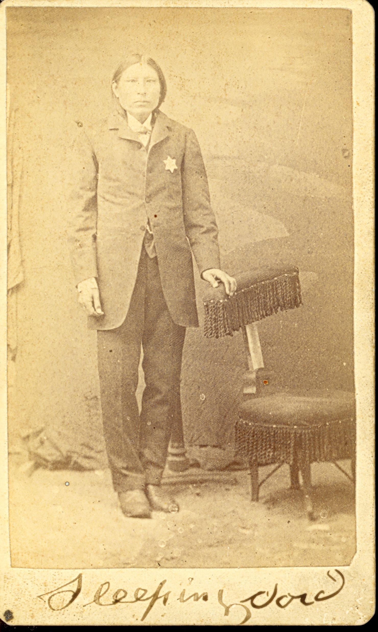 LIBI_00124_05198; An albumen carte de visite (card photograph), depicts an Indian man in a tailored suit, wearing a policeman's badge. A handwritten ink notation on bottom portion of mount reads: "Sleeping [il]". There is foxing on the verso. It was produced by Godkin on an unknown date.; carte de viste; Courtesy of the National Park Service, Little Bighorn Battlefield National Monument, LIBI_00124_05198, Godkin, "Native American Man in Tailored Suit and Police Badge," date unknown.